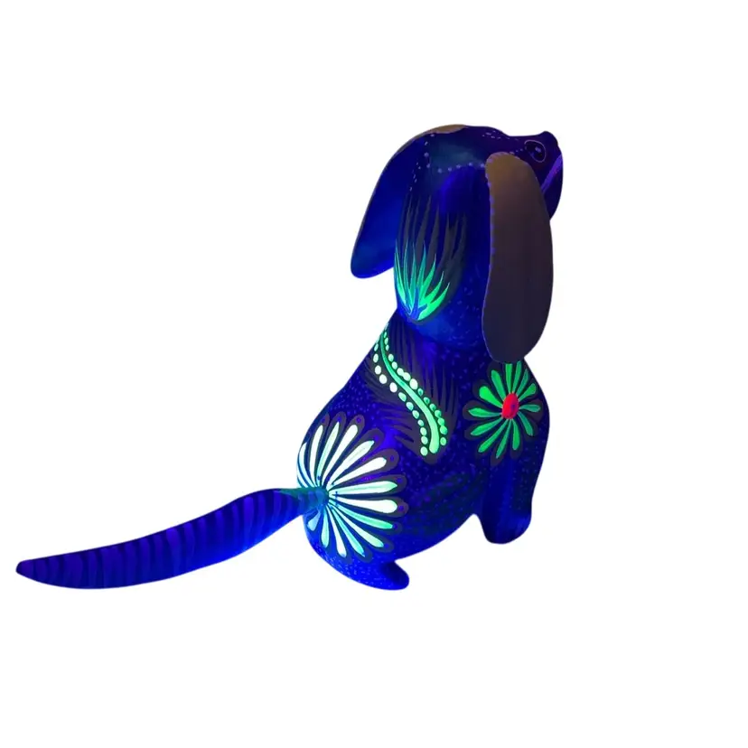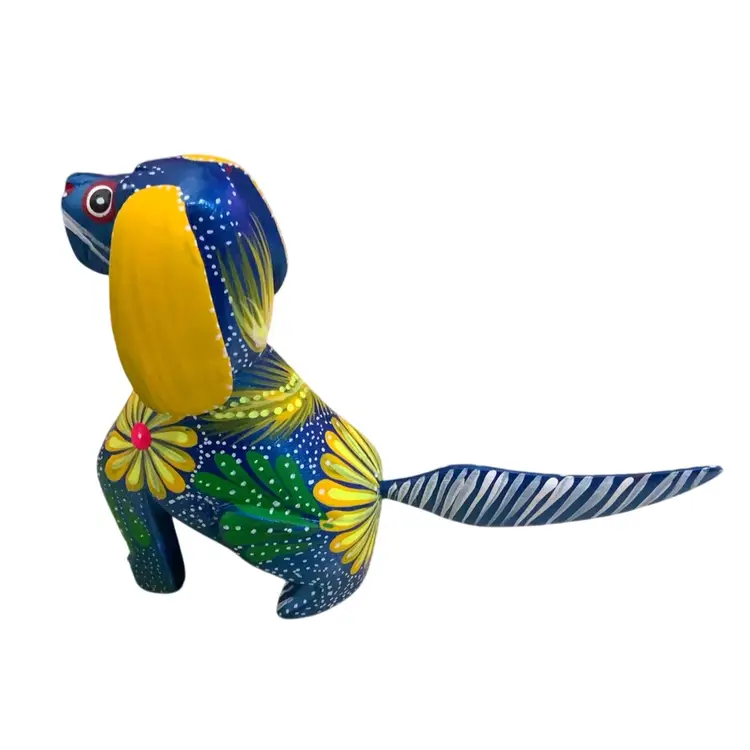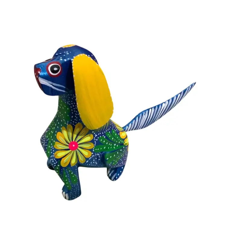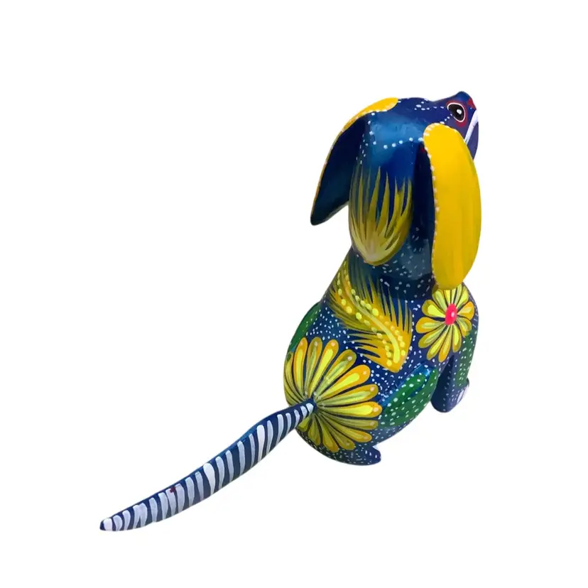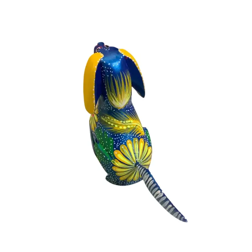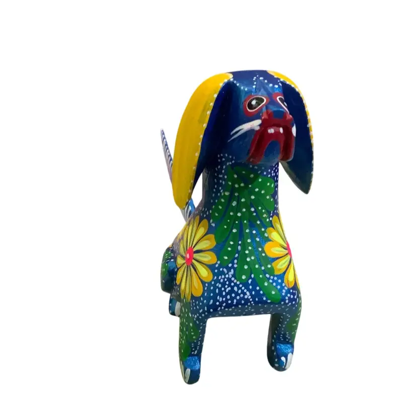 This is an Alebrije, a brightly colored Mexican folk art sculpture, specifically a coyote. Alebrijes are often made of wood and hand-painted with intricate patterns and vibrant colors. They represent fantastical creatures or animals and are considered to be spirit guides or protectors. 3” by 2.5”