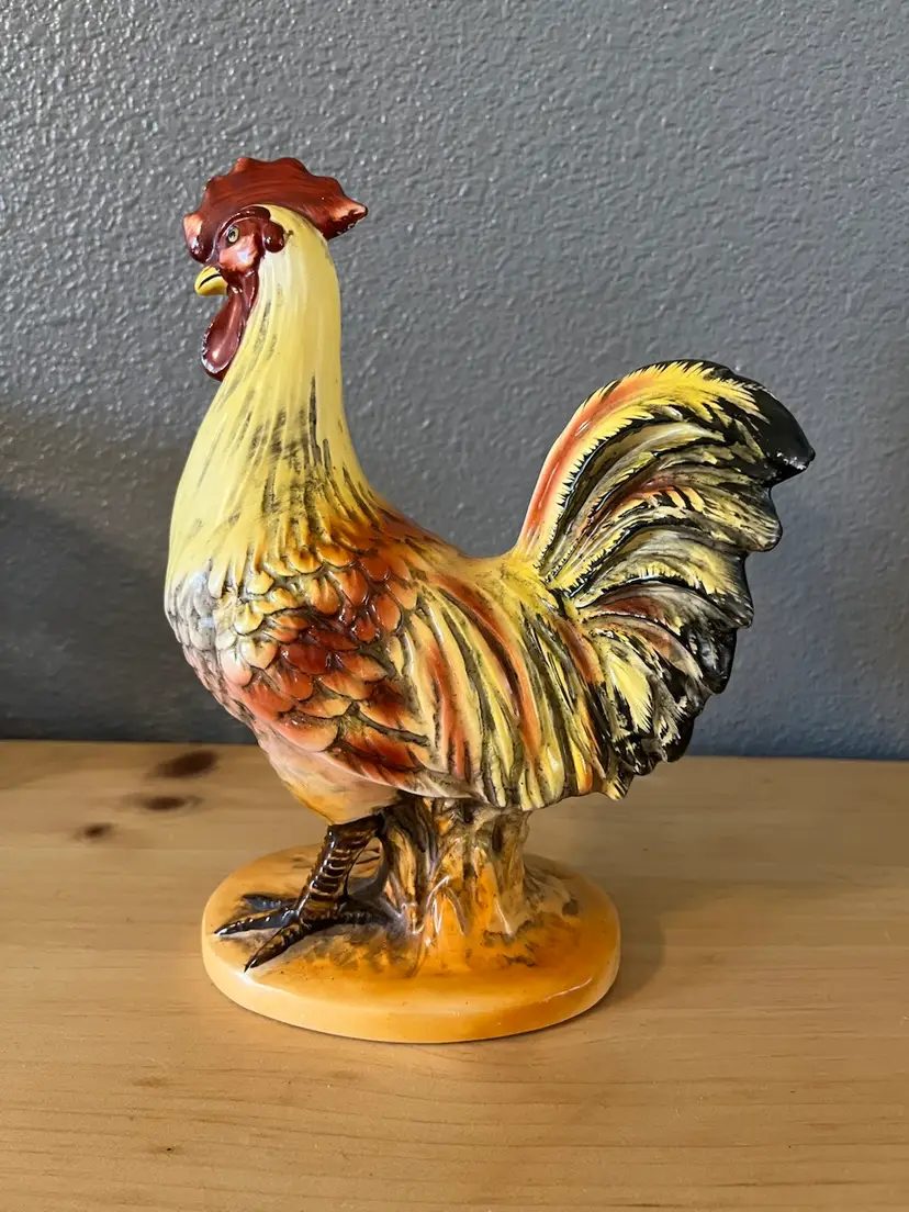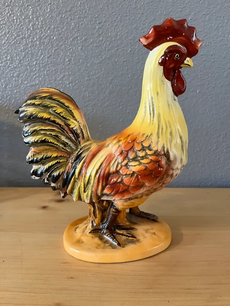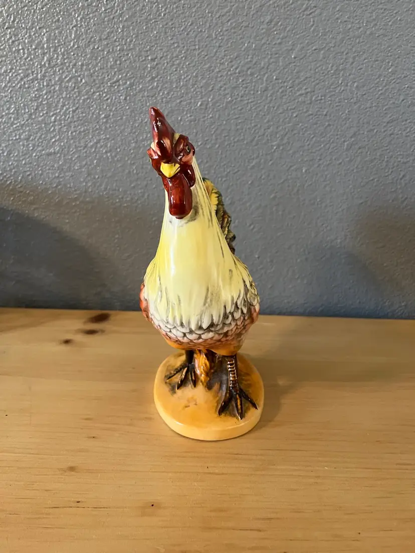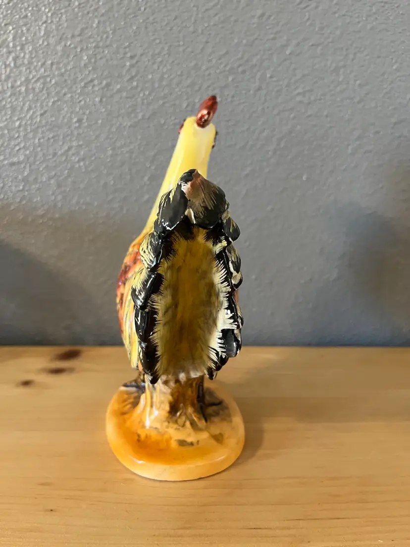 Absolutely gorgeous colors especially if you're into yellow and orange!! Slight paint wear on comb, and throughout body feathers. He is approx 8.5"H, 6.75" W, 13.1 Oz