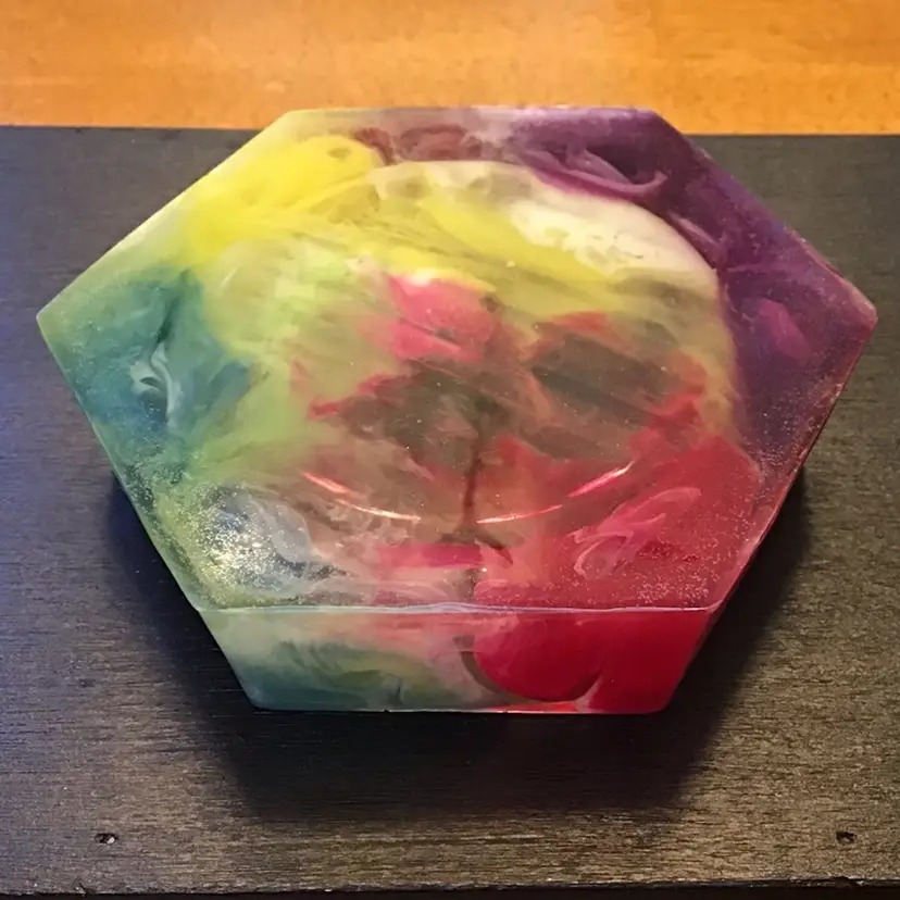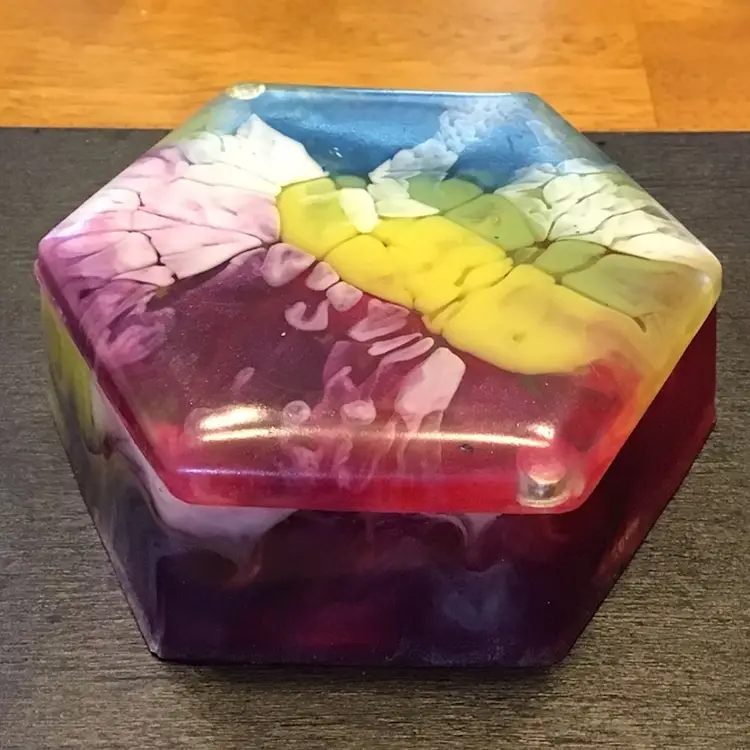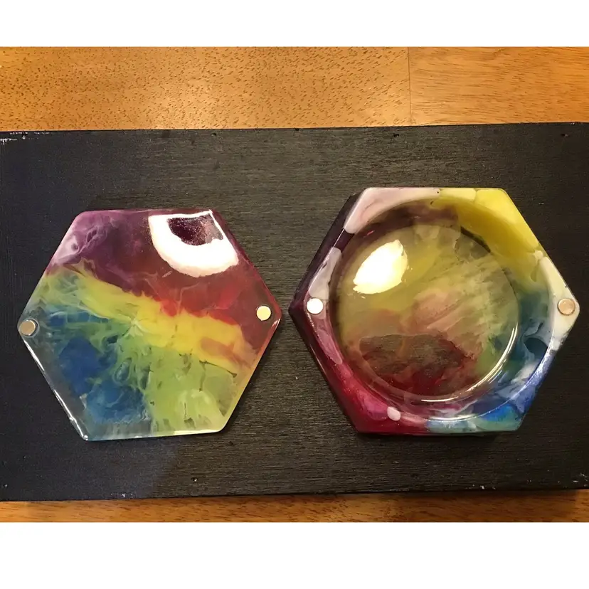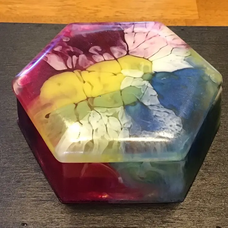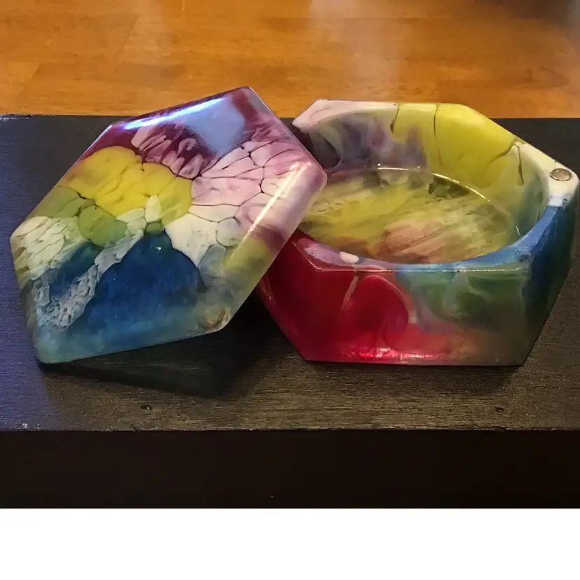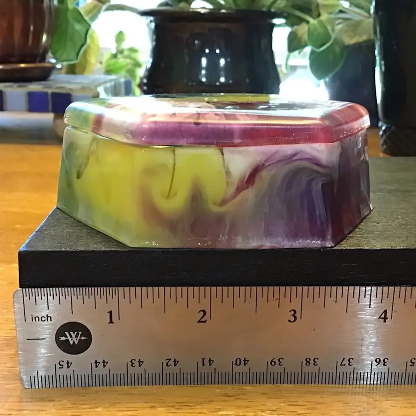 Beautiful lucite box with multiple colors is in great condition. No chips, cracks, or repairs. Lid closes with two strong magnets. Size is in the pictures. See all pictures as they are an important part of the description.