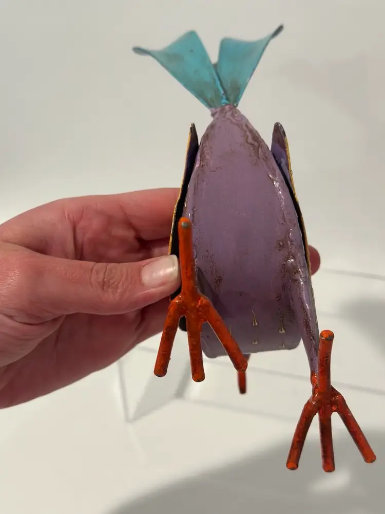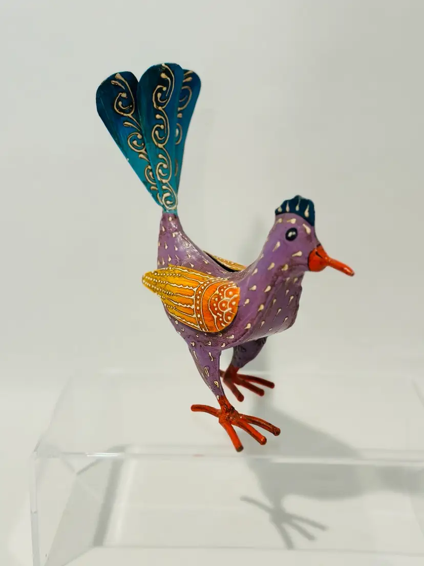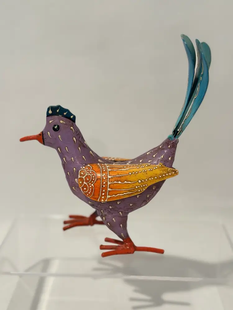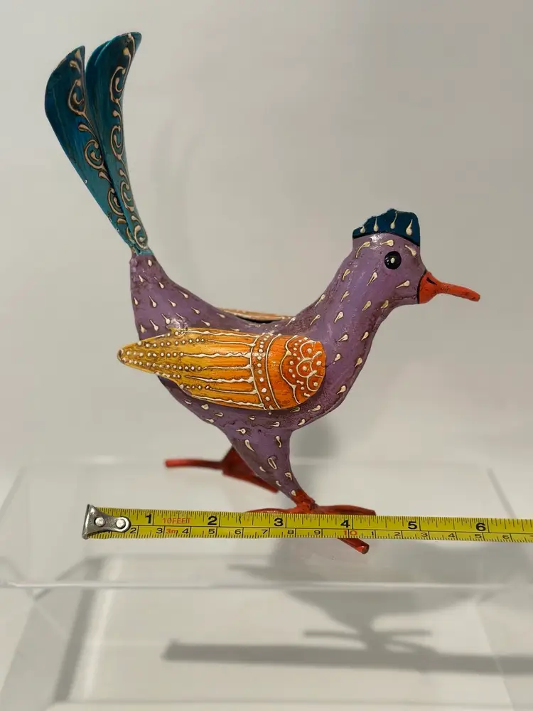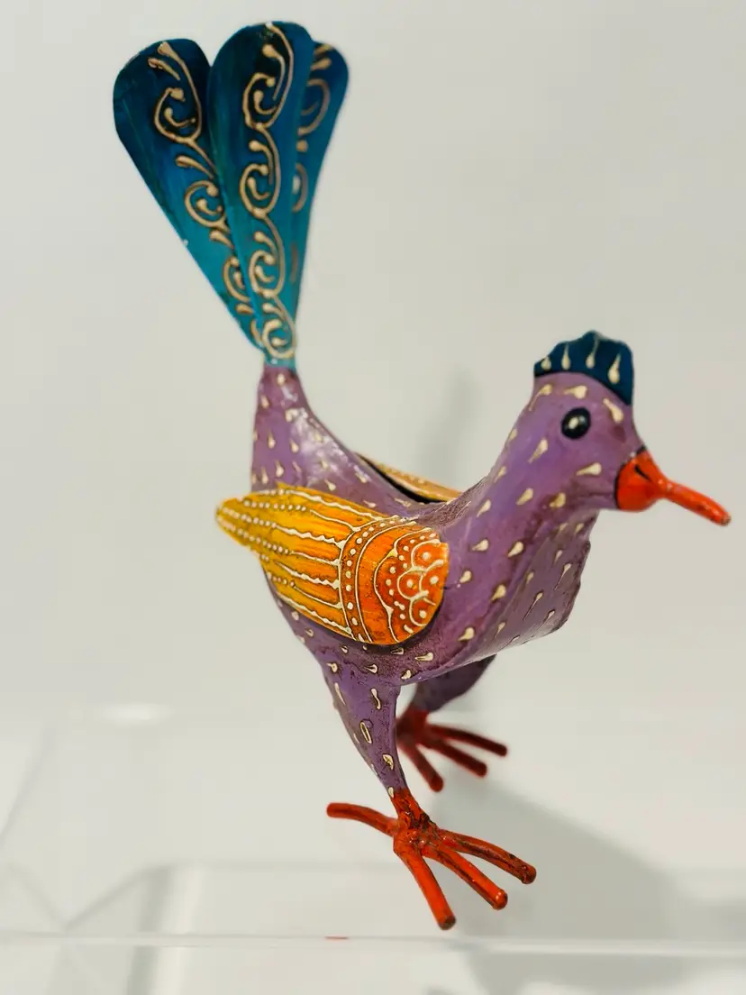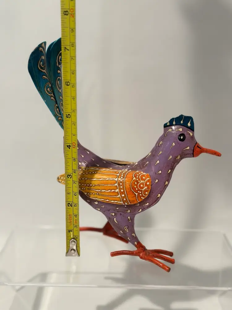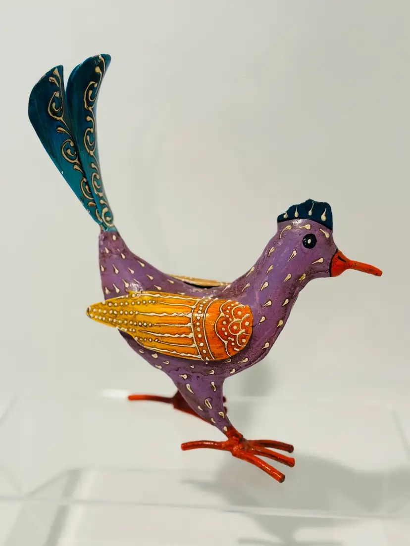 This colorful metal bird figurine is a unique addition to any folk art collection. With intricate designs and a distressed finish, it exudes a rustic and primitive style that is sure to catch the eye.