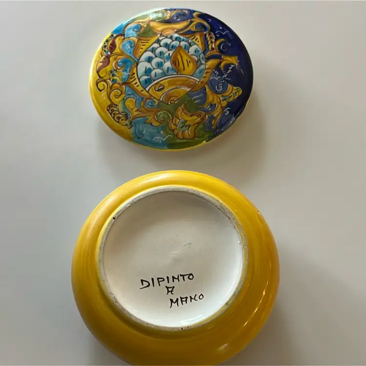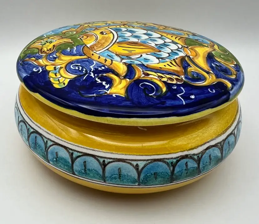 Round, hand-painted decorative piece with colorful fish on lid. Measures 5.5” in diameter x 2.25”tall. Made in Italy.