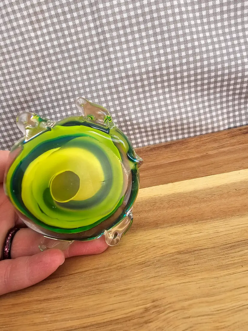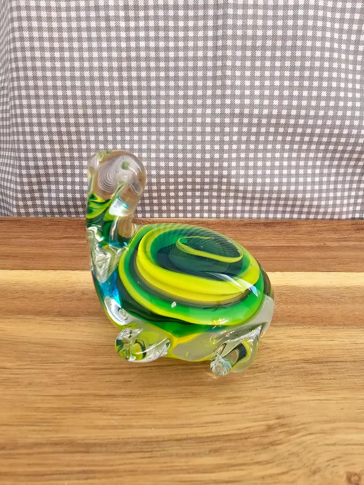 Charming glass turtle paper weight with vibrant green and yellow swirls. A delightful addition to any collection or a perfect gift for turtle lovers. Adds a splash of color to any space.