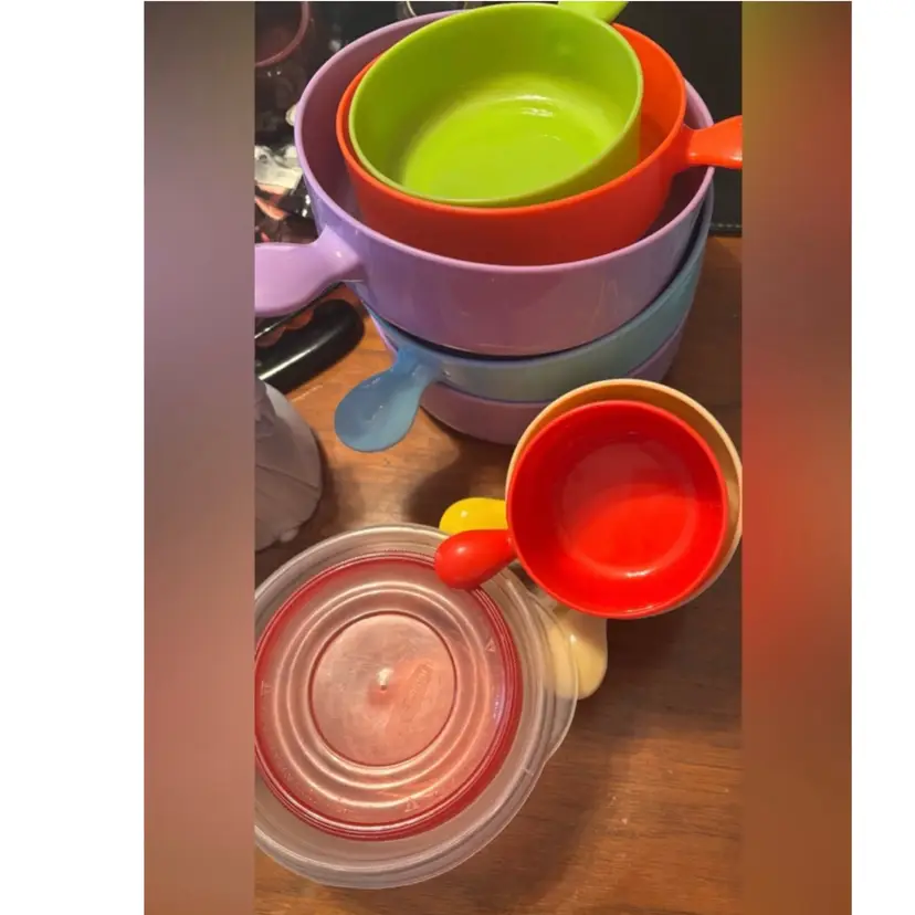 Set of vibrant stackable microwaveable bowls with easy-grip handles. Durable, lightweight design for everyday use. Bright green, orange, red, purple, blue and cream colors add cheerful style to your table. Dishwasher-safe and convenient for serving soups, cereals, and snacks.
