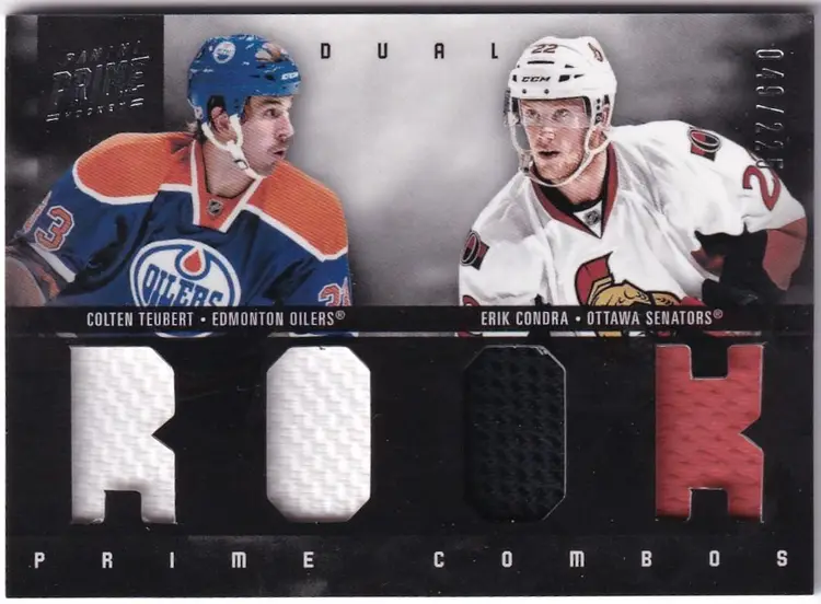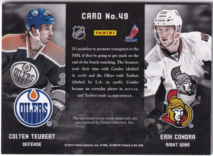 2011-12 Panini Prime Combos Jerseys #49 Colten Teubert/Erik Condra Edmonto Oilers Ottawa Senators Print Run - 225