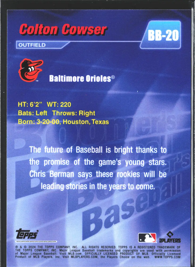 1st time buyer? Get $5 Off with code DISTRICT5 at checkout! Card as shown. All cards $20 and under ship PWE via lettertrackpro [https://www.letter-track.com/registerap.asp?AFID=8757] Type: Sports Trading Card Sport: Baseball Team: Baltimore Orioles Player/Athlete: Colton Cowser Manufacturer: Topps Features: Rookie Autographed: No Year Manufactured: 2024 Vintage: No Autograph Authentication: Topps Season: 2024 League: Major League (MLB) Material: Card Stock Original/Licensed Reprint: Original Country/Region of Manufacture: United States Set: 20241 Topps x Chris Berman Boomer's Baseball