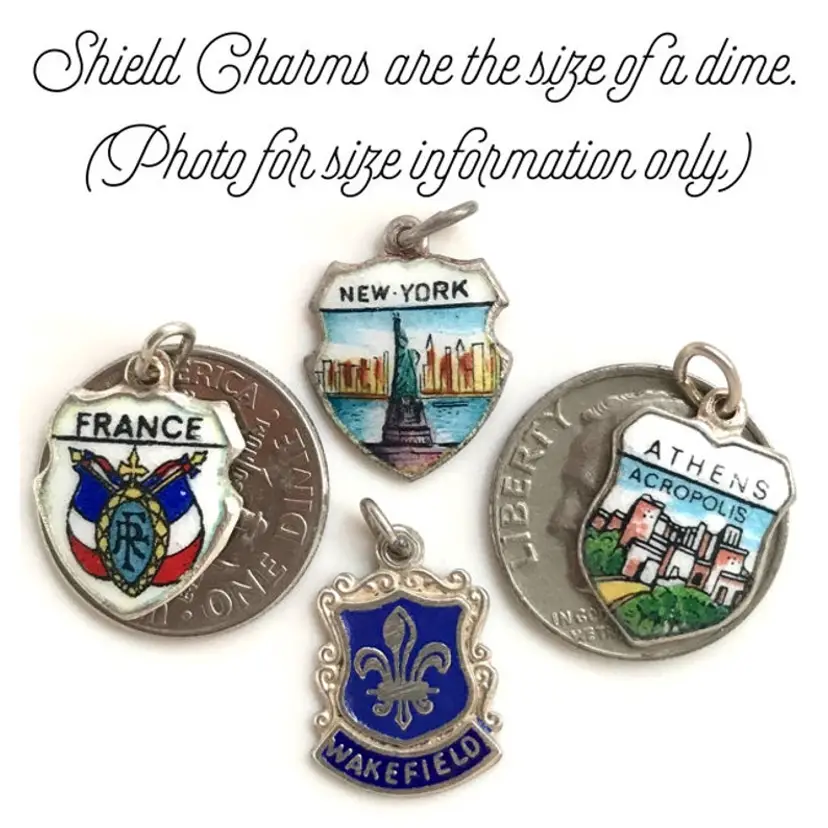 Shield Charms History: These Sterling silver enameled travel shield charms were popular with European, British and American travelers in the 1940's, 1950's 1960's, 1970's, and are highly collectible items today. The colorful vintage retro look is very appealing to collectors and are quite the conversation piece. Some have a vintage patina and some look like they are brand new even if they are over 50 or 60 years old. They are wearable postcards and miniature works of art. Women documented their travels by collecting a souvenir shield charm depicting the town or country coat of arms crest, a scenic picture of the area, castles, a famous landmark (Eiffel Tower), building (White House), person from history (Mozart) or an event (Olympics), and were often given to women as souvenirs or gifts from their men or friends who were traveling abroad. The traditional and most popular type of shield charms were made in Germany by the REU company. British style shields with the scrolled edge were made by the Mizpah Company in England. In the 1970's an Italian maker made some shield in a slightly different shield shape and the colors and design style is beautiful with more muted colors. They were made in different silver grades for the budget of every souvenir charm buyer...from a base metal version, silver plated, 800 silver to sterling silver. More Info: Most of the travel shield charms that I sell are like new (New Old Stock) even though they are at least 30 years old and never been worn. I also sell many charms that have been removed from vintage charm bracelets that I collect from all over the world. Some charms from Germany, Austria and Switzerland are from pre-owned vintage bracelets. Send A Wish List: Even if you don't see it here, I might have the location you are looking for and will list it for you. I have thousands and thousands of charms not yet added. Send your inquiry or wish list via email.