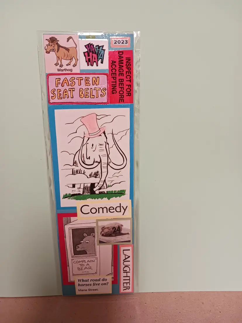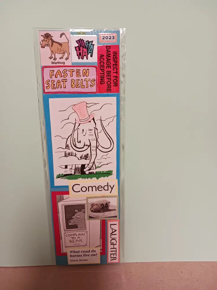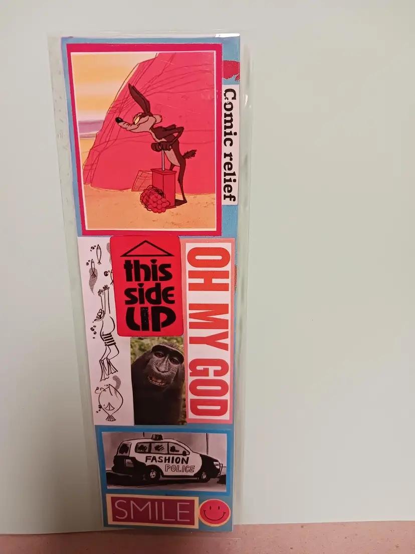 Front and back of humorous bookmark creation to amuse you! One of a kind unique art piece. Content sourced from used magazines from the 1940s to the present. Approximately 8 3/4" x 2 3/4".