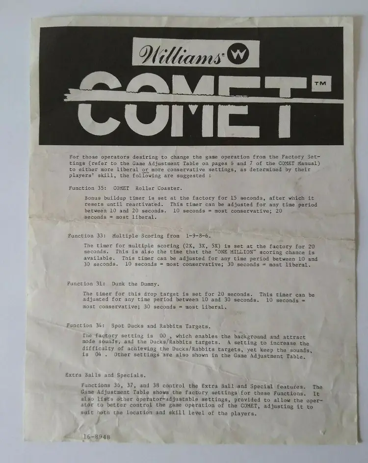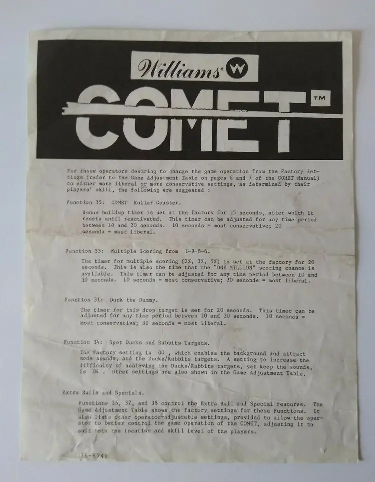 Model: Comet Pinball: Flyer Subject: Operators Information Sheet Modified Item: No Country/Region of Manufacture: United States Year: 1985 Brand: Williams