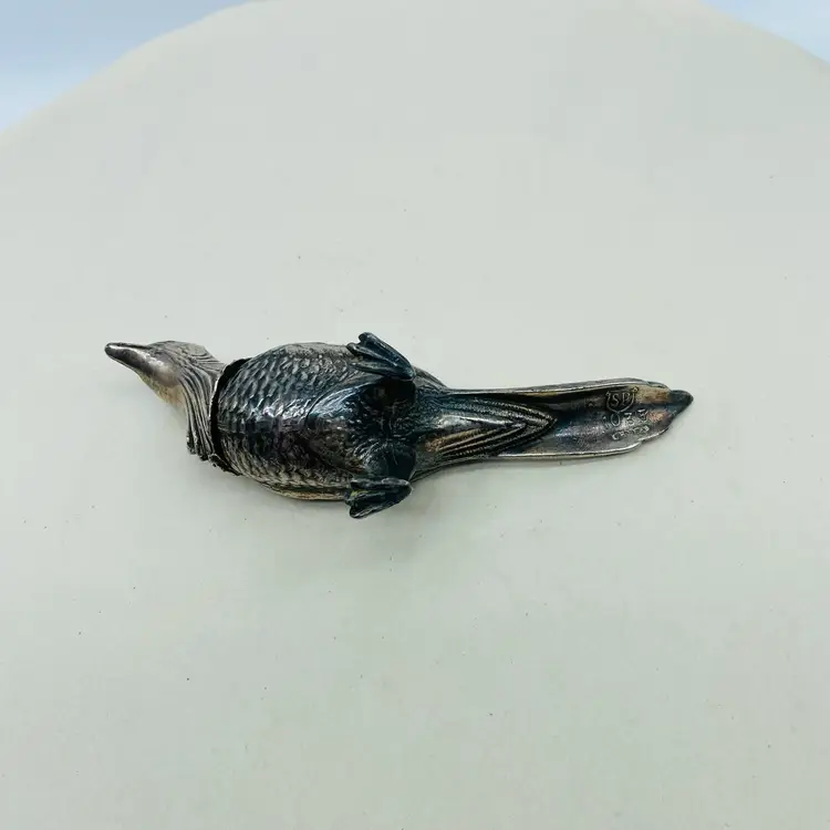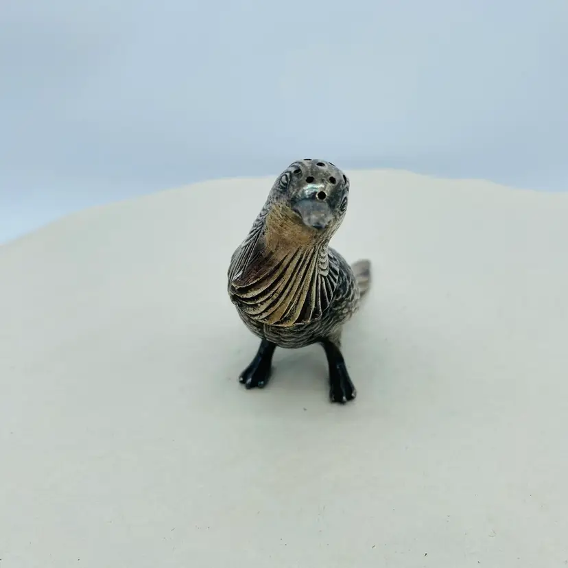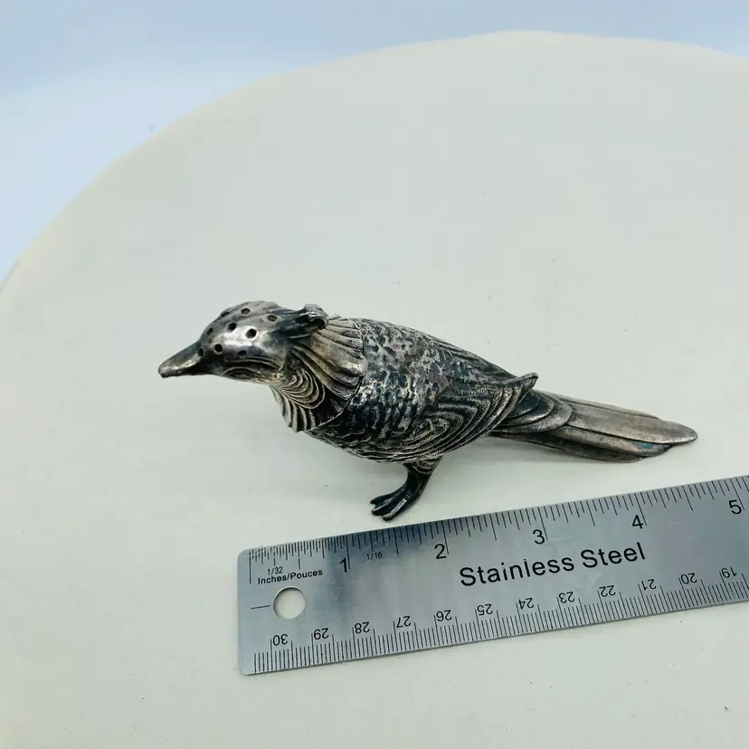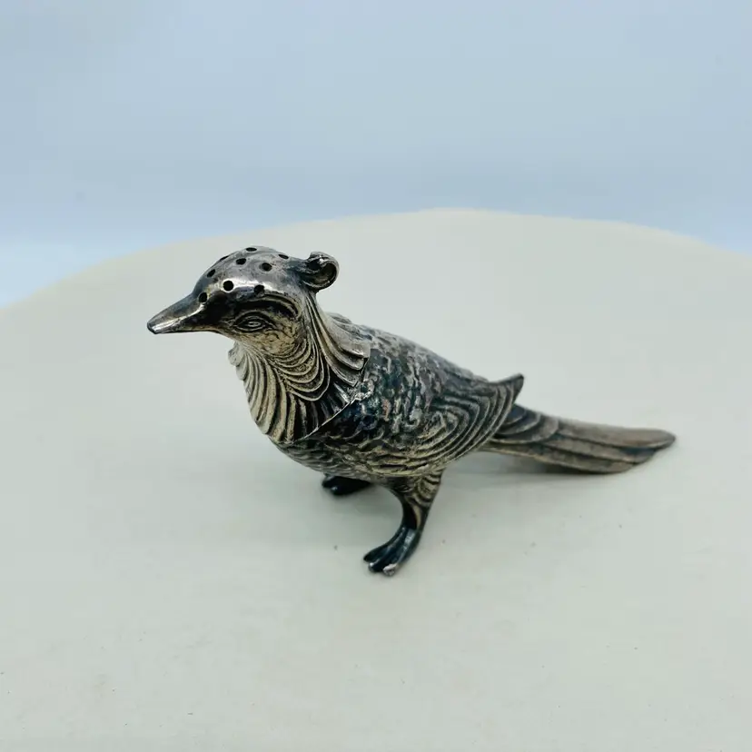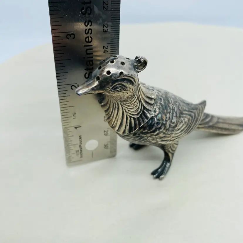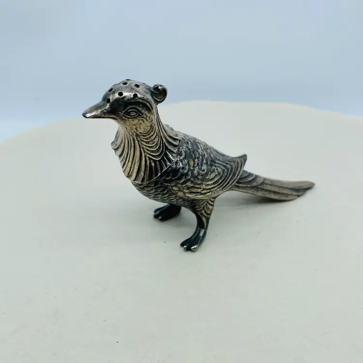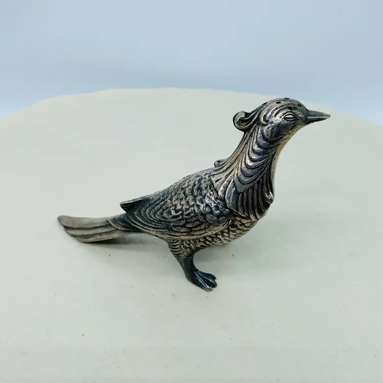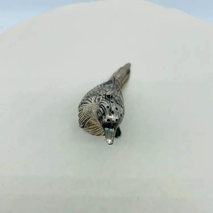Weidlich Bros C-942 silverplate salt or pepper shaker single, shaped like a bird, most likely a pheasant. It is silver plated and features a detailed design with holes on the head for dispensing salt or pepper. Good condition Works as an ornament too 5 x 2.5 inch