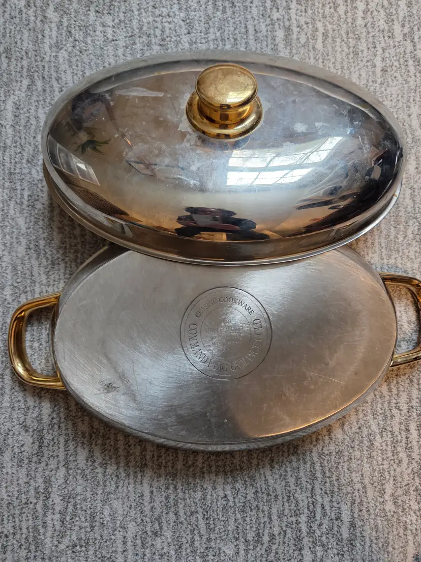 The item is a Command Performance Gold Cuisine oval roaster/casserole dish. It is made from 18/10 stainless steel and features distinct gold-plated accents on the handles and lid knob. These roasters are induction-compatible, oven-safe, and designed for versatile cooking, including roasting, searing, and serving.