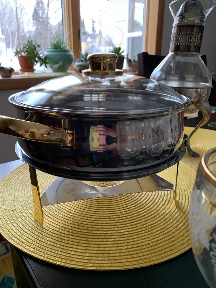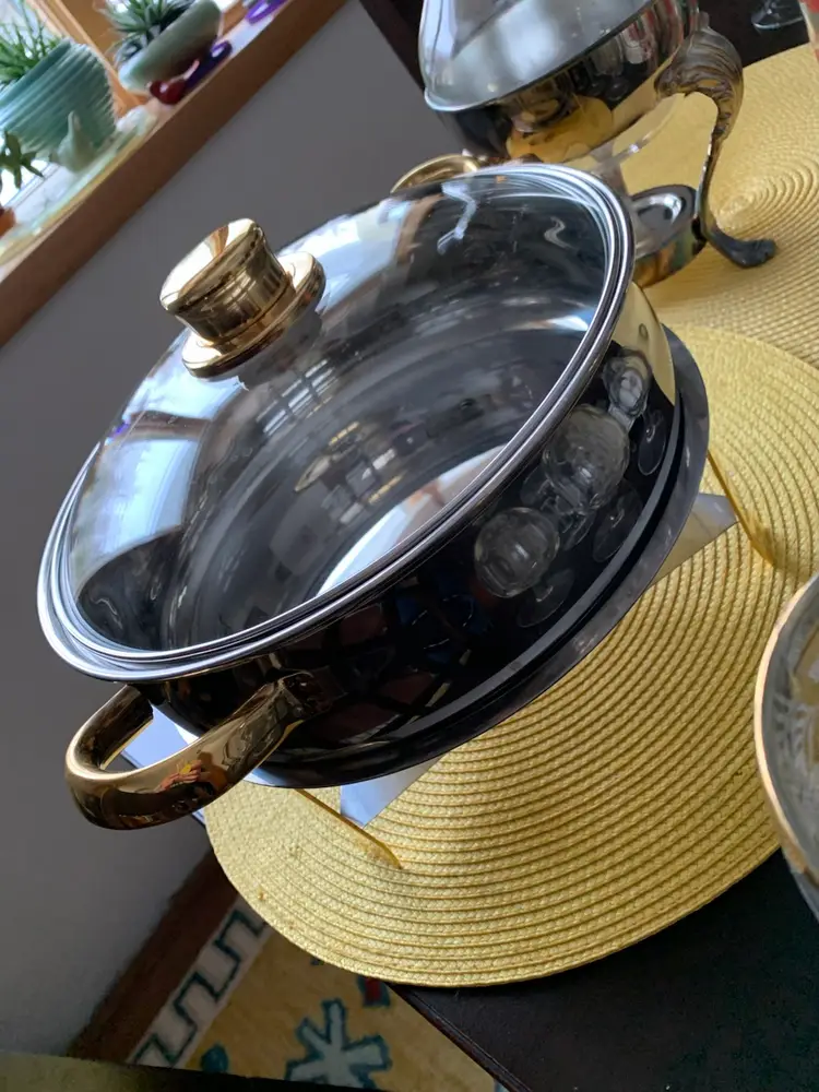 This beautiful chafing dish is from cuisine cookwear in the command performance gold series. Comes with the chafing stand. 18/10 stainless steel. In like new condition.