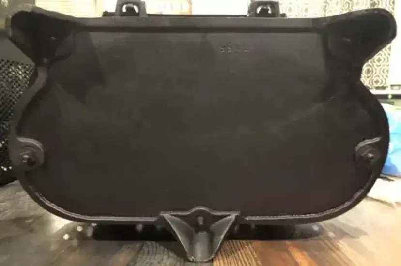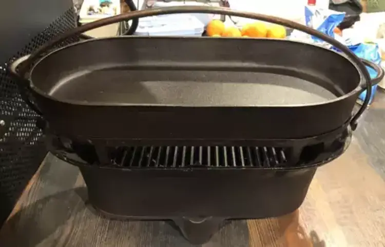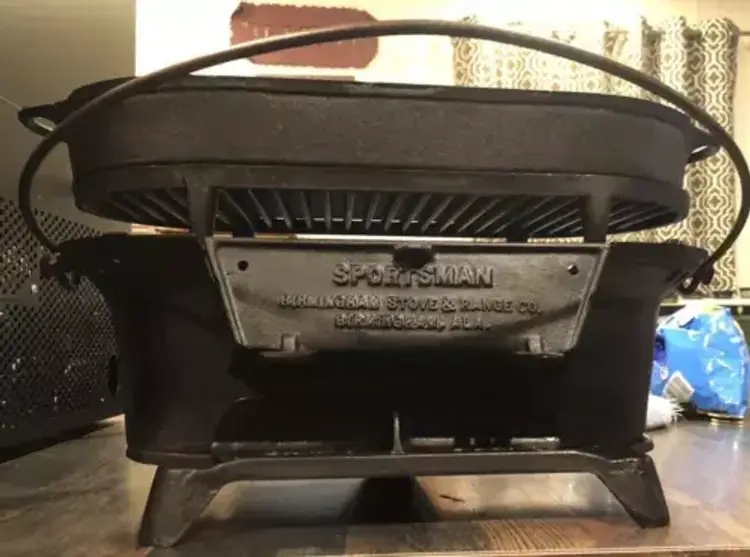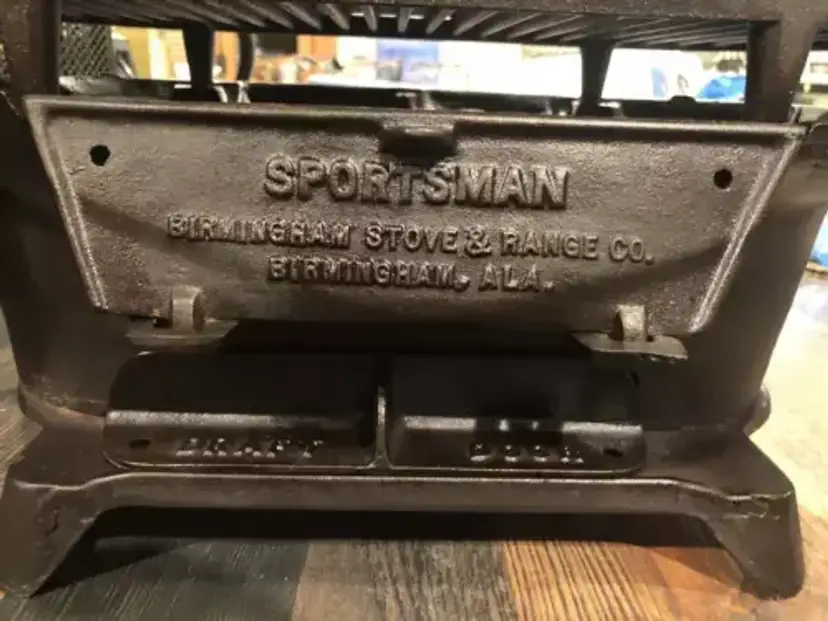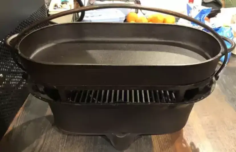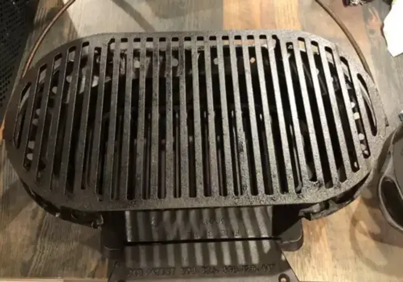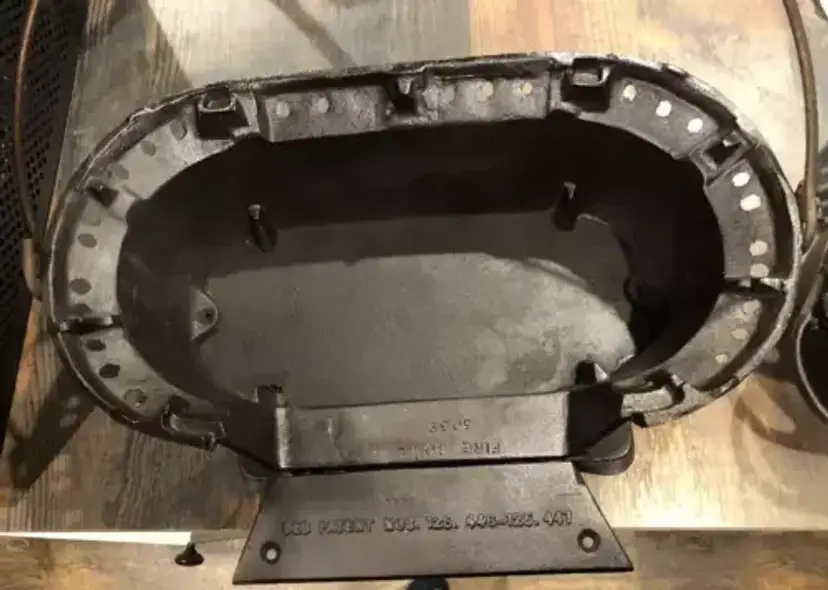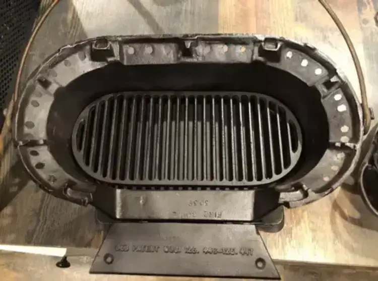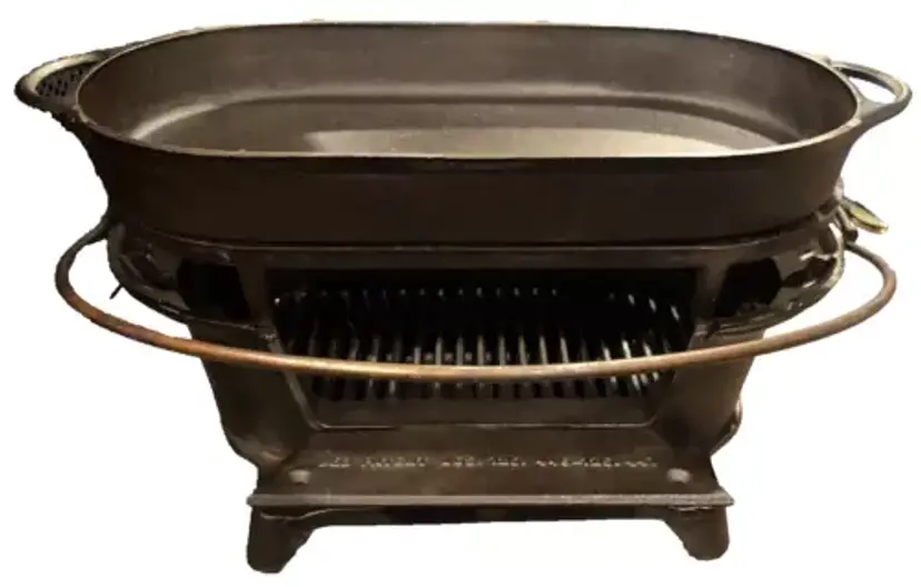 Code for $5.00 off your first purchase: BRIHS16 Includes the Original Burner, Burner Door, Interior Coal Grill, Top Meat Grill, Fish Fryer Pan, Air Vent and Handle. It is extremely rare to find this complete. Production of the unit was limited. There is about a 5" crack on the plate (see pictures) but it does not affect the use of the grill. This item has been cleaned and seasoned, ready for use. 37 pounds + Box and Wrapping = est. 40 lbs. 10" H (including Fryer Pan, Excluding Handle) About 9" W Fryer pan = 20" L including Handle Please reach out for more questions. This item is being sold "AS IS"