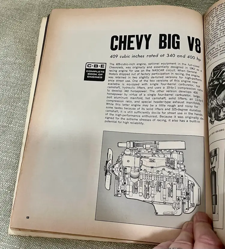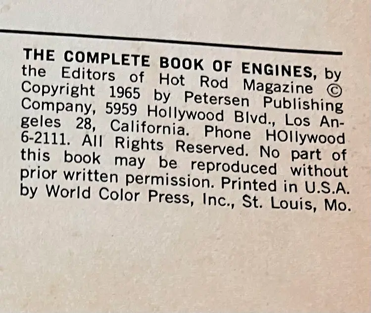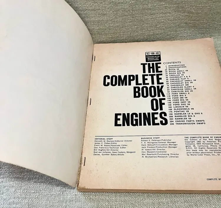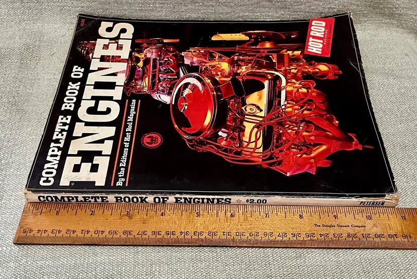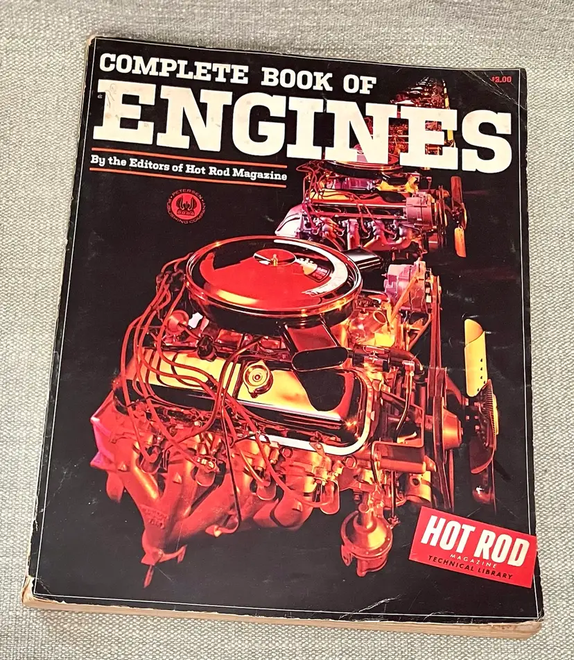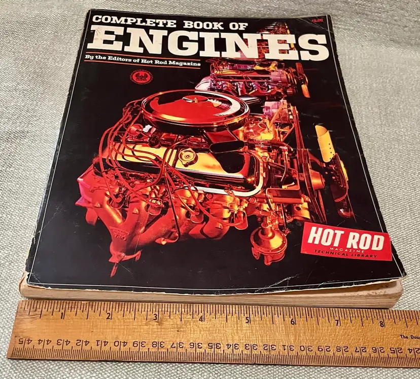 The product is a softcover book titled "Complete Book of Engines" published in 1965 by Hot Rod Magazine editors. It 224 pages features illustrations and is focused on engines: Coravair, Cadillac, Rambler, Pontiac, Olds, Ford, Chrysler, Chevy. The book is a comprehensive guide for car enthusiasts looking to learn about engine maintenance and repair. The publication is from the United States and provides valuable information for those interested in classic cars and their engines.