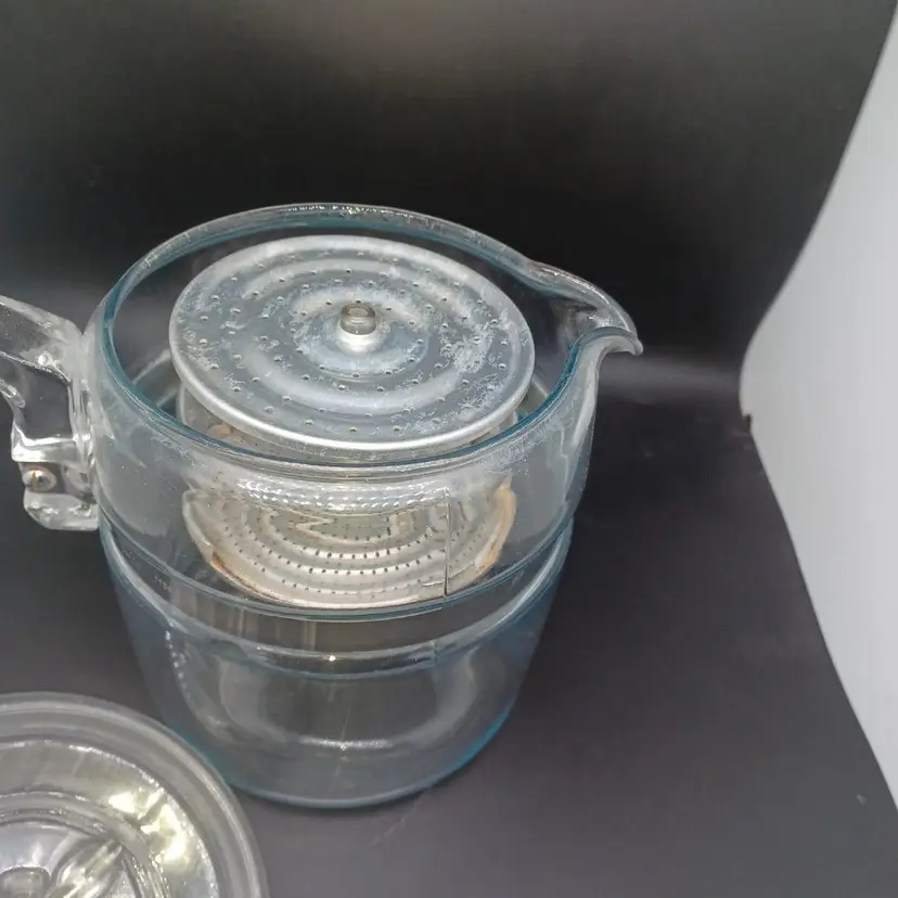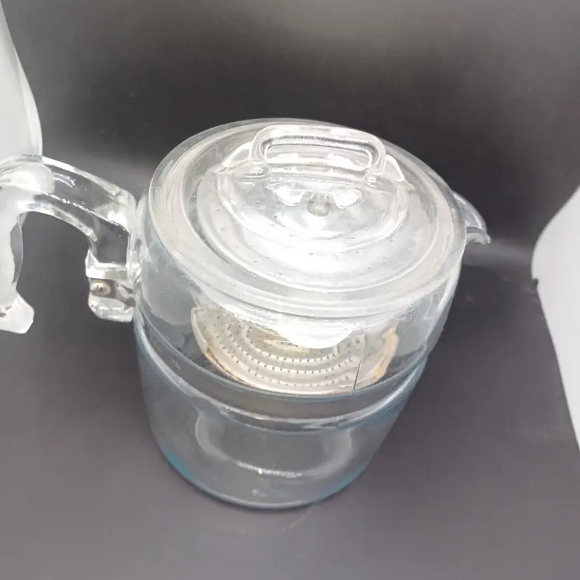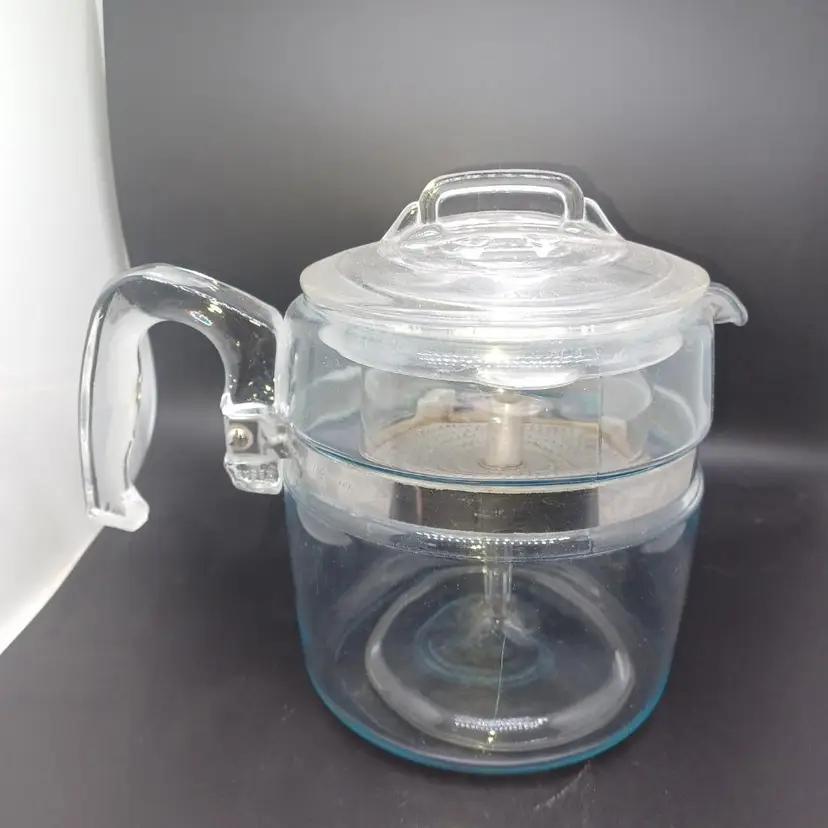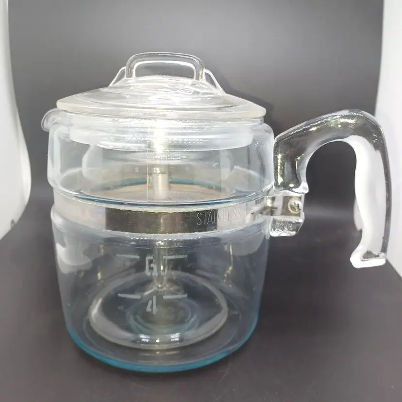 COMPLETE Pyrex Flameware Glass Stovetop 6 Cup Coffee Pot Percolator - Complete with the 1940s style lid glass stem and basket is really what you're after on this rare piece Since those are the most common to get broken, will be shipped with each item separately Boxed inside a box, so shipping will be a little bit more than normal. Please see all pictures as they are the best description. All items from a smoke free home with pets experience glass shipper