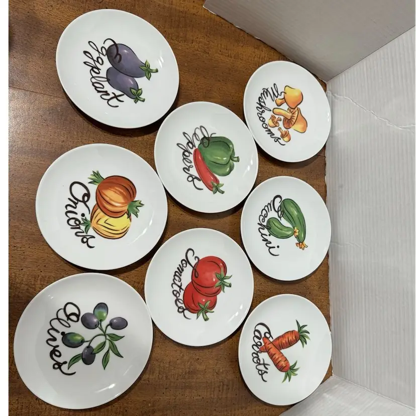 Set of 6.5” Lenox Plates - Vintage Veggie theme: Mushrooms, zucchini, carrots, peppers, tomatoes, eggplant, onions, olives. This is a complete set of 8 Excellent condition. Plates were displayed and never used.