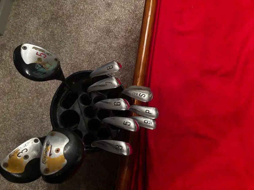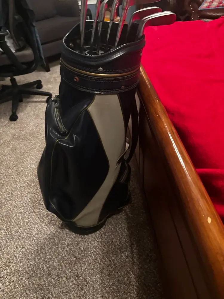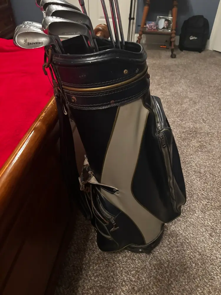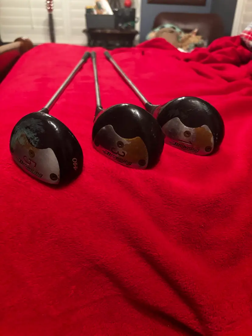 Complete vintage Browning 440 set of golf clubs with decent shape blue and gray leather Palmer bag. Hickory and Persimmon woods I believe and shallow face irons 3,5-SW. Bag is good looking but older leather bag and all zippers work. $75 for all.