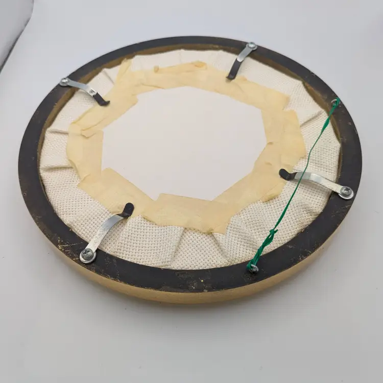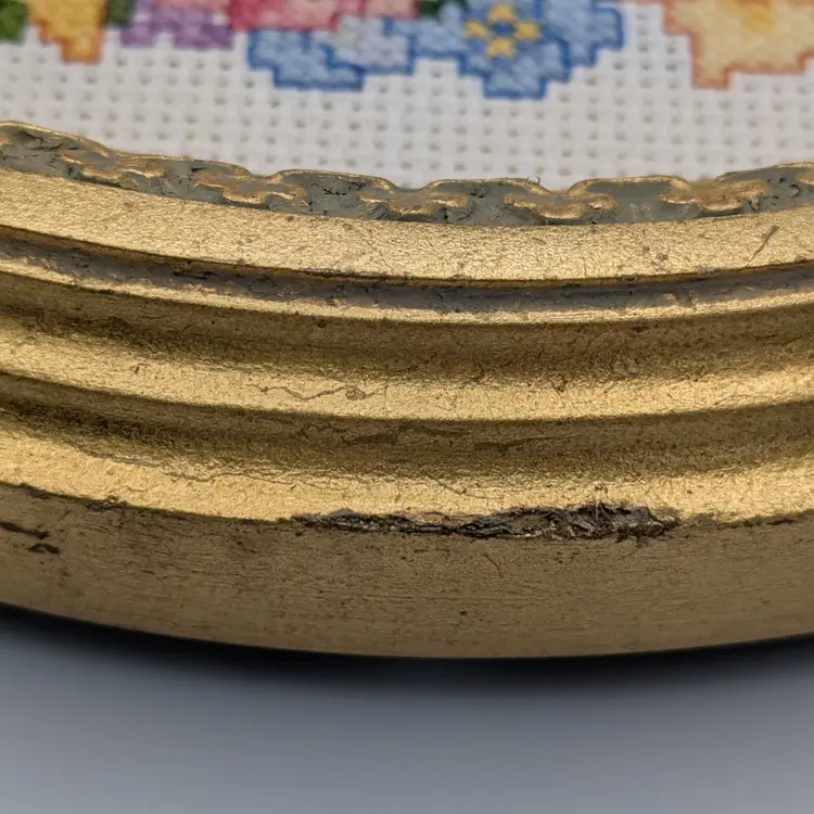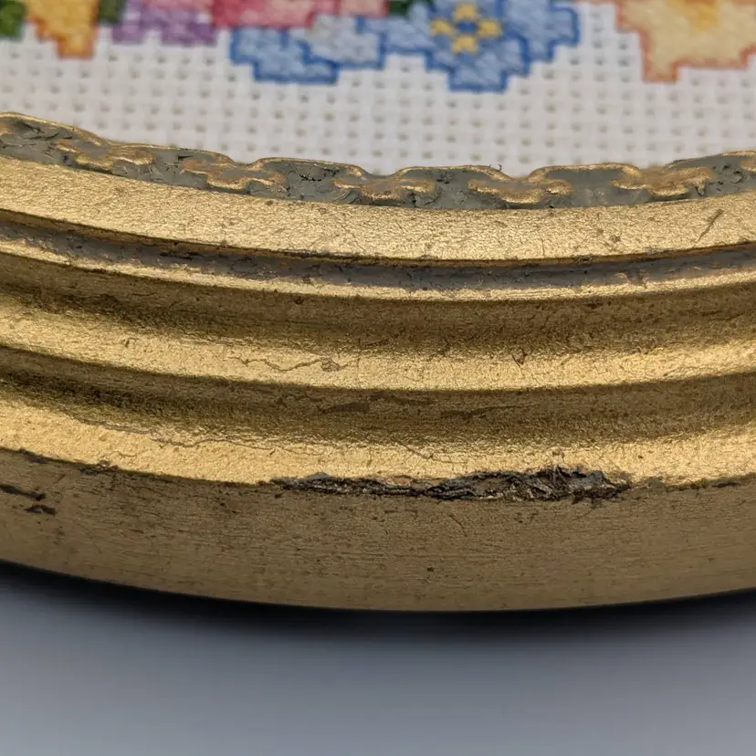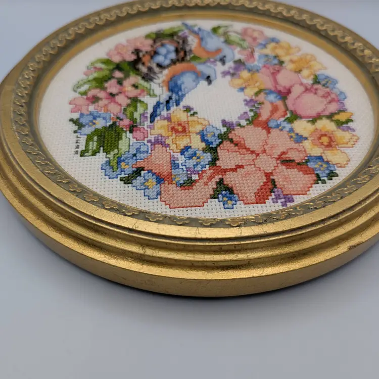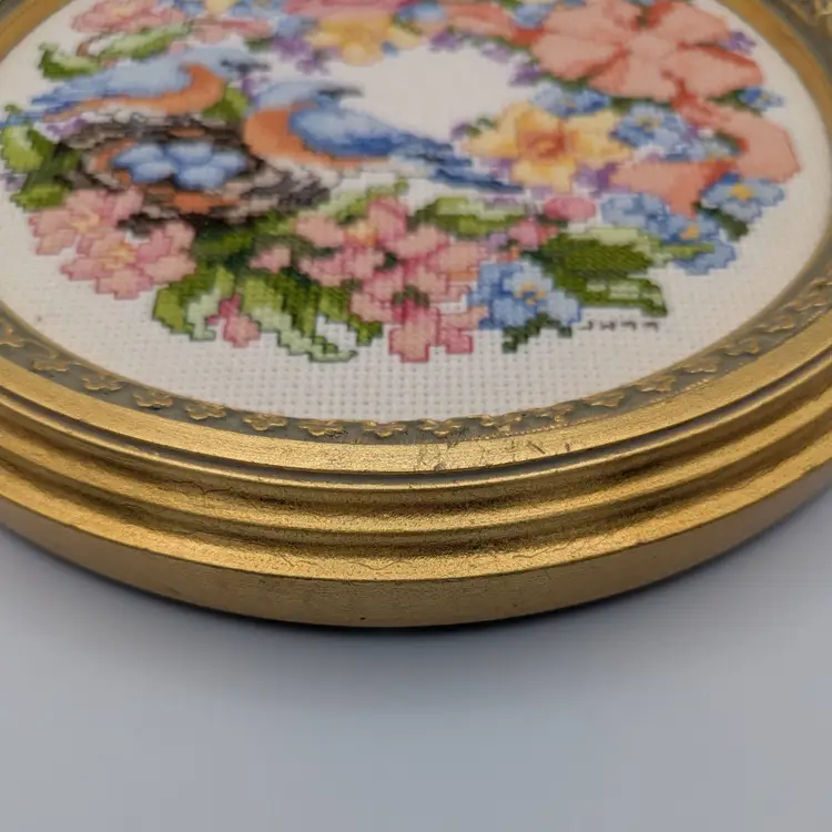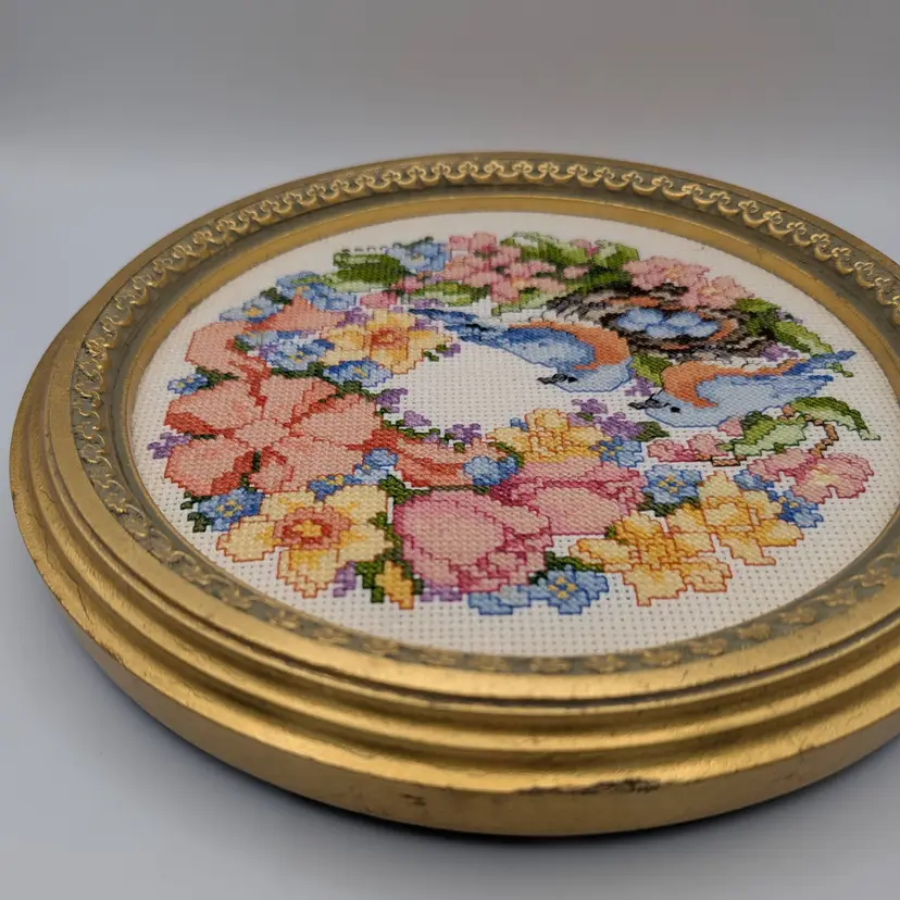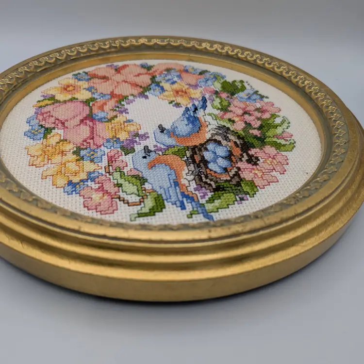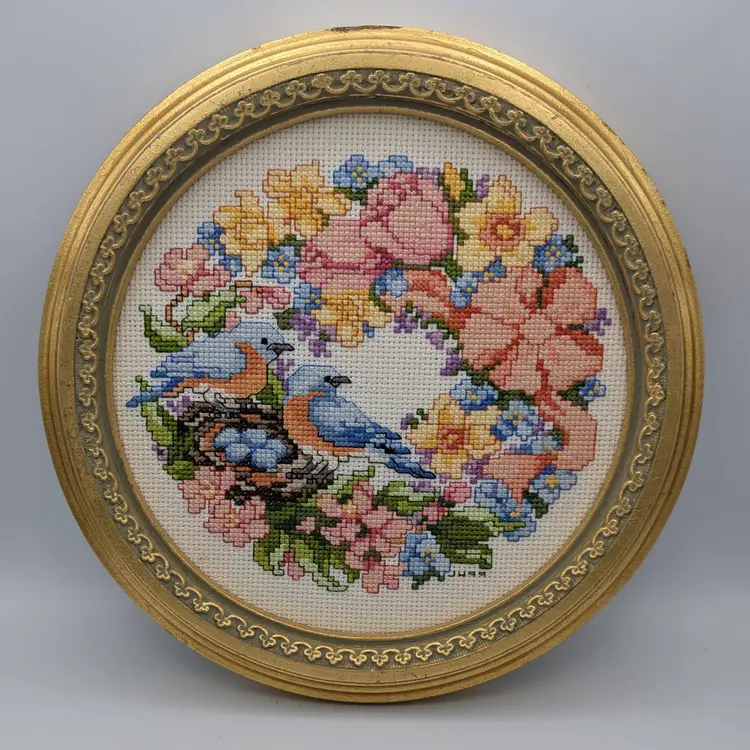 This is a beautiful completed cross stitch made by loving hands. The blue birds protecting their nest among the colorful flowers is wonderful The family member who completed this beauty did initial it- I didn't want to remove it- but you could. It was completed in 1999. The gold round frame measures 10 inches across. Please see photos for the slight dings in frame. Nonsmoking home. Non pet home