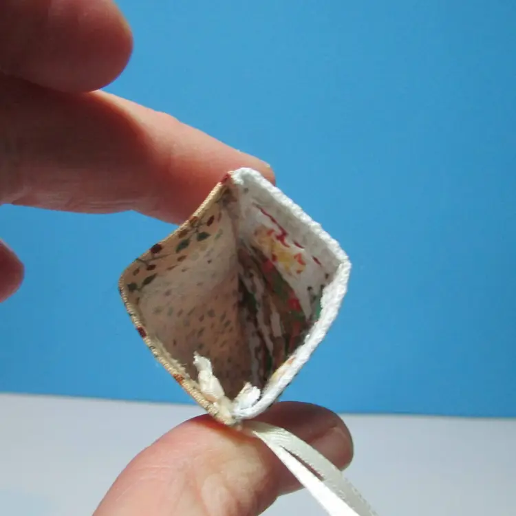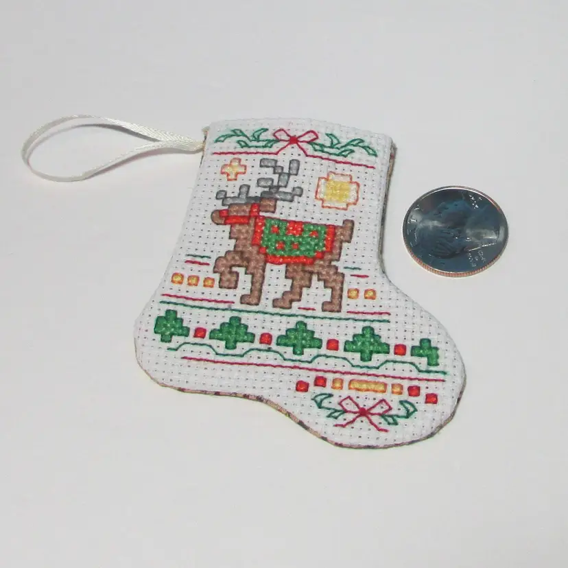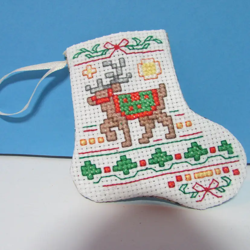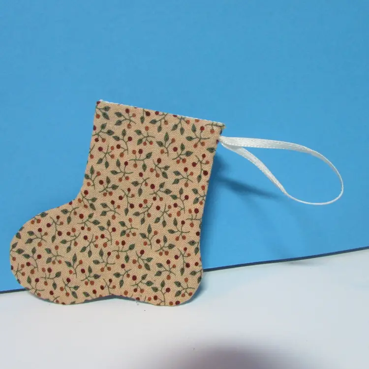 This adorable ornament was stitched by mom, she added some vintage fabric to the back. This little stocking does open so you can add a small gift. It is about 3" x 3". This is shipped from a smoke free home. Thanks for looking!