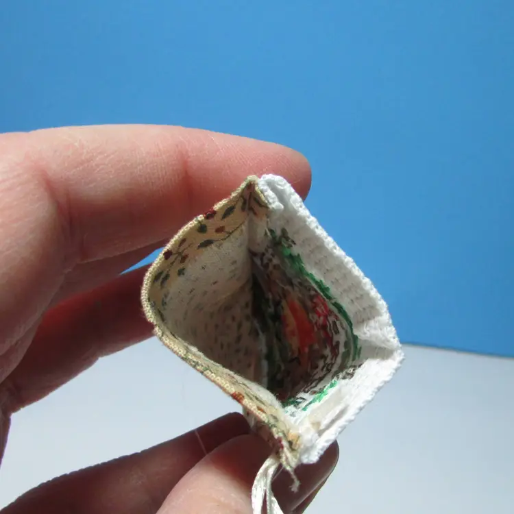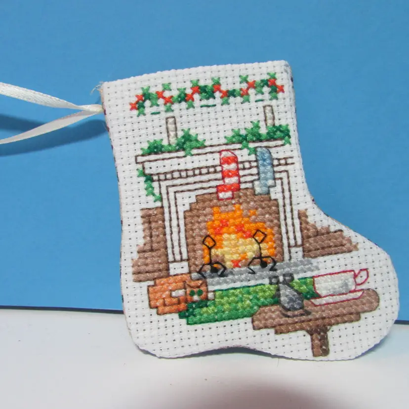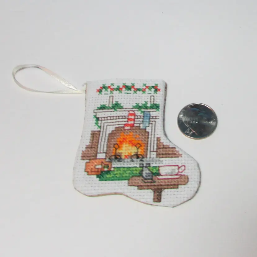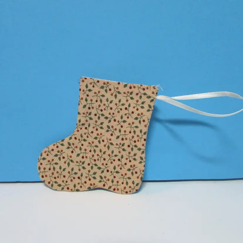 This adorable ornament was stitched by mom, she added some vintage fabric to the back. This little stocking does open so you can add a small gift. It is about 3" x 3". This is shipped from a smoke free home. Thanks for looking!