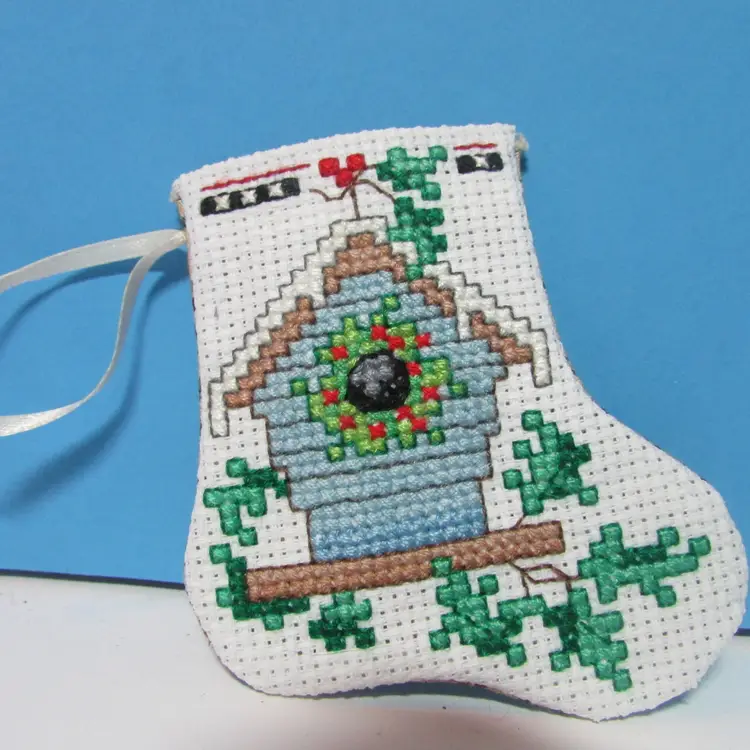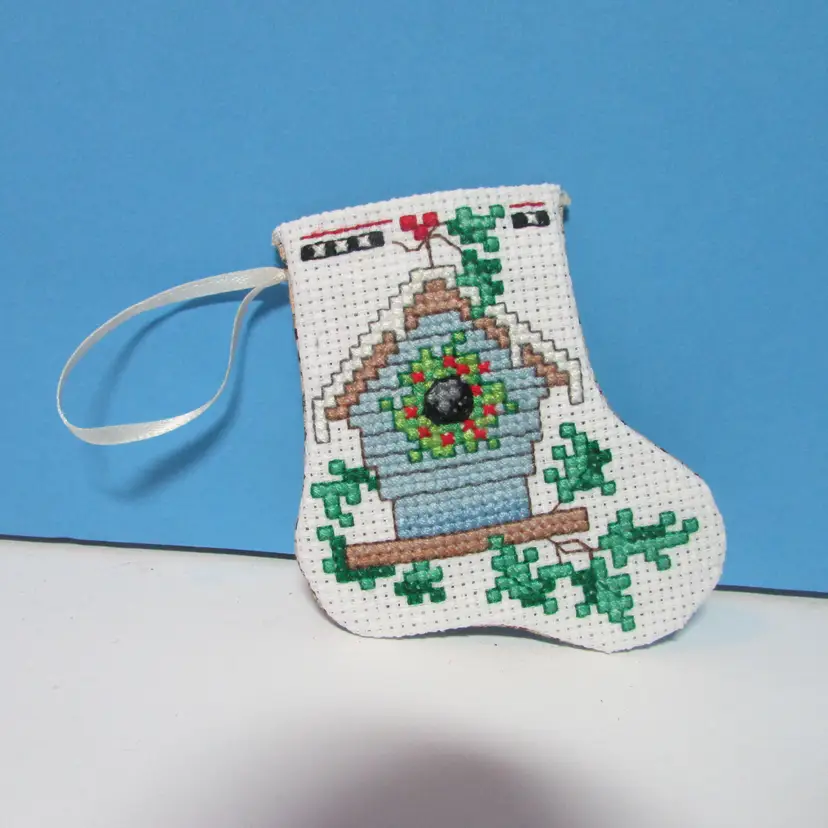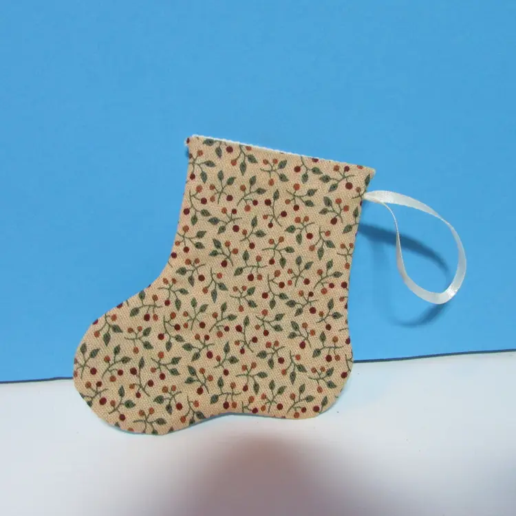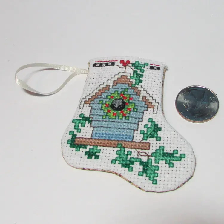 This adorable ornament was stitched by mom, she added some vintage fabric to the back. This little stocking does open so you can add a small gift. It is about 3" x 3". This is shipped from a smoke free home. Thanks for looking!