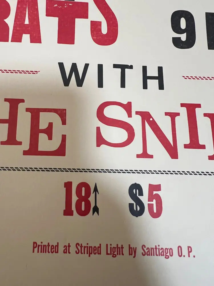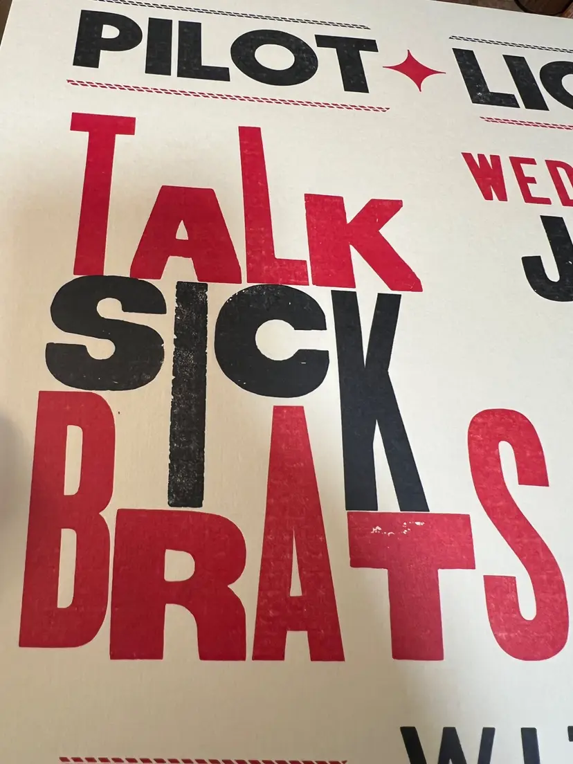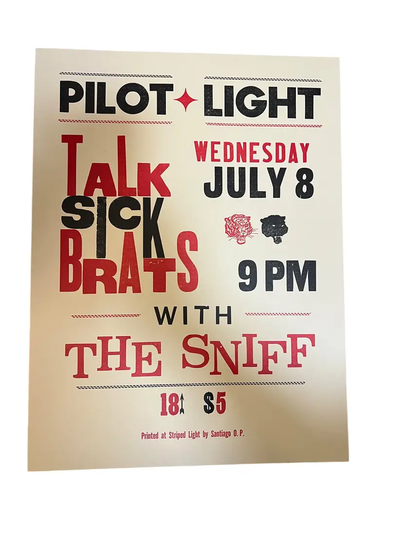 Event poster showcasing a live Talk Sick Brats with The Sniff concert at the Pilot Light in Knoxville, Tennessee. Talk Sick Brats are a punk rock band from Houston, Texas. The poster measures 16.75" x.12.5". The concert was on a Wednesday, July 8 which means the poster is either from 2015 or 2020. It was printed at Striped Light printing shop in Knoxville.