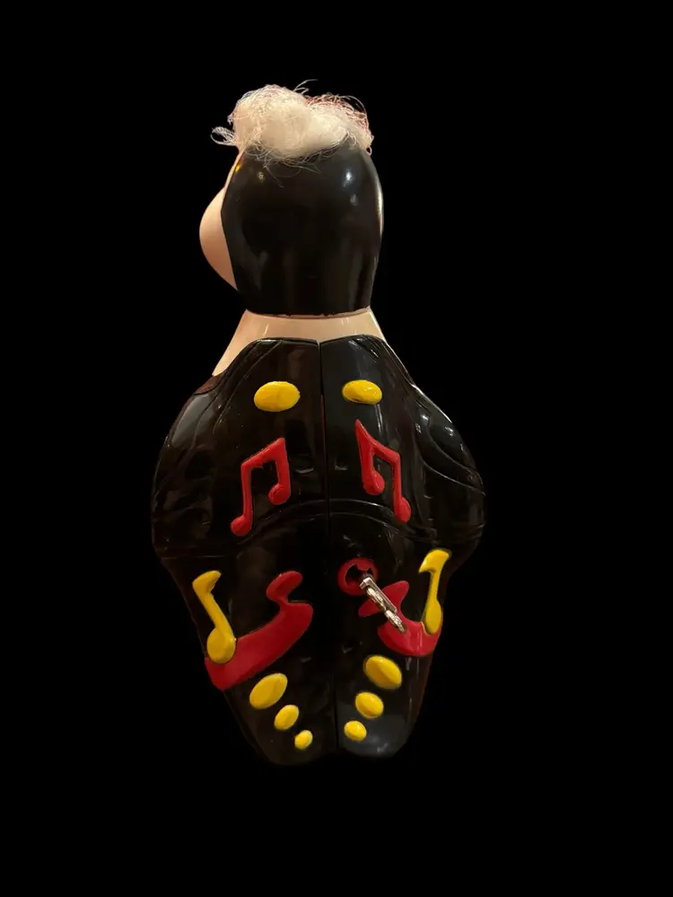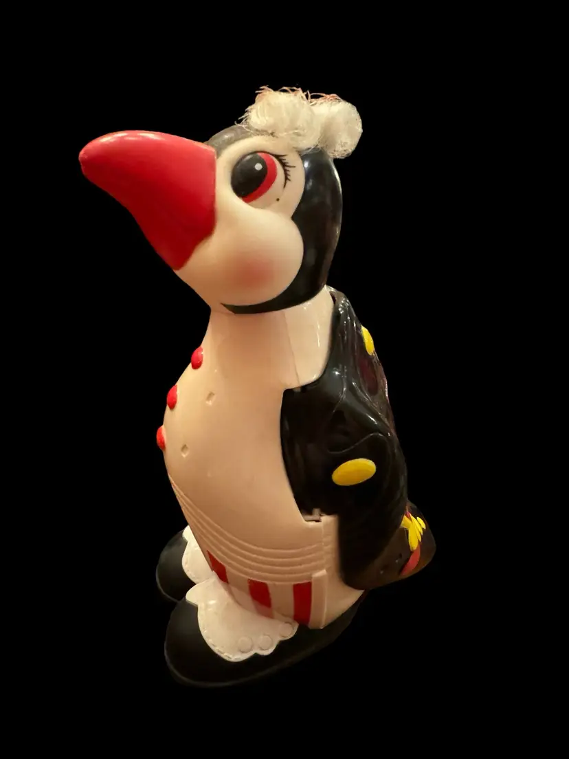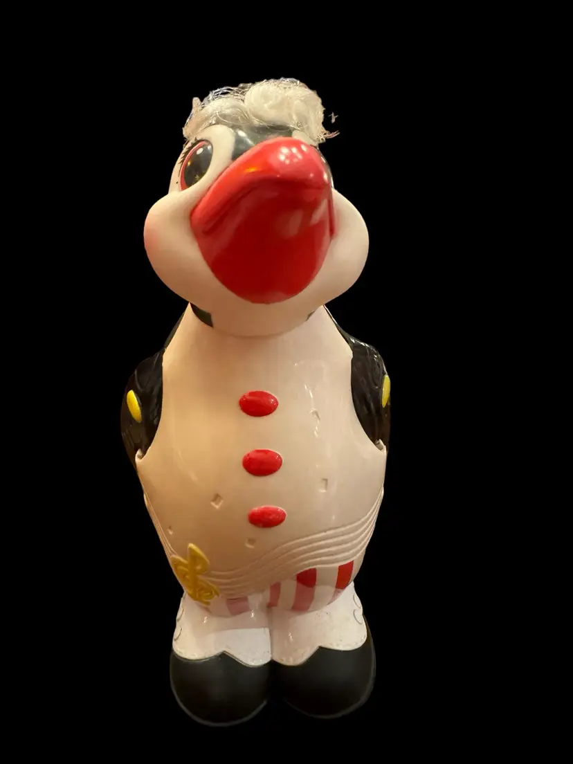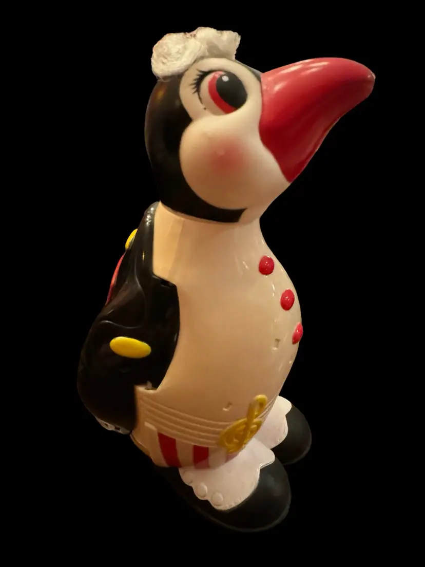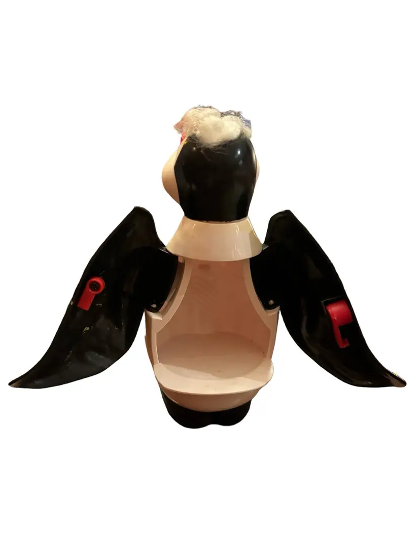 Super cool hard plastic vintage penguin. In excellent condition. Key unlocks back, penguin spreads his wings and reveals a secret compartment. How cool to use as a gift card holder? 9” tall x 5” wide.