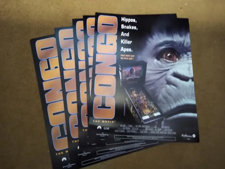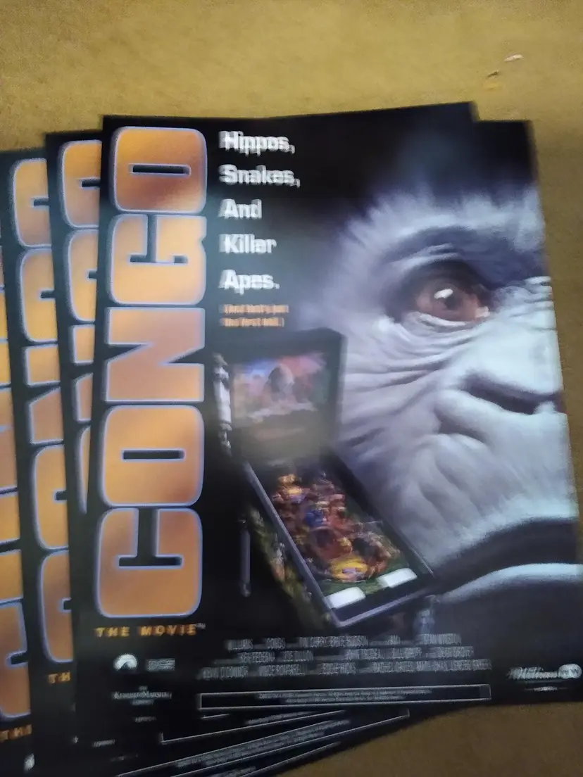 Dealer of of (15) total Congo pinball machine wall posters made in 1995. Only $5.00 each so lots of profit can be made. NOS unused. These are ready to frame and feature great artworks from the movie that came out during that time. Size is 28.25" X 22.25". Light wrinkles only. Shipped with care.