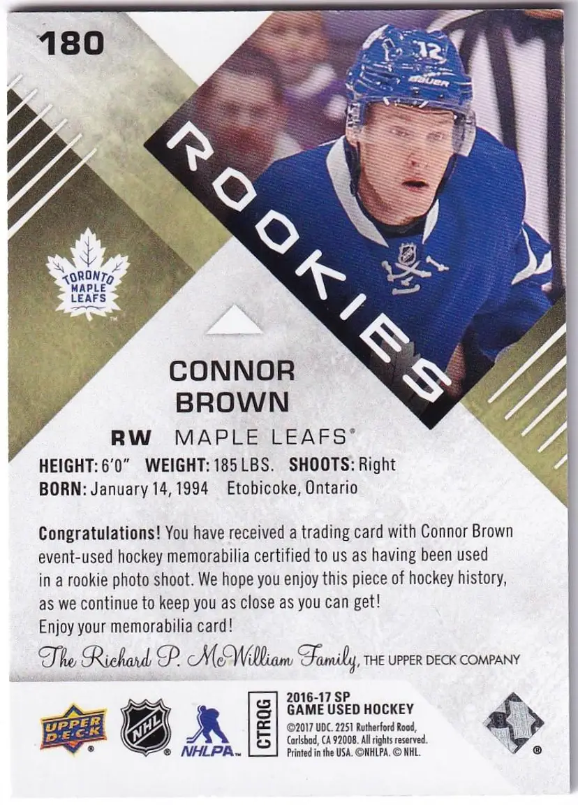 2016-17 SP Game Used Gold #180 Connor Brown JSY Toronto Maple Leafs Print Run - 399