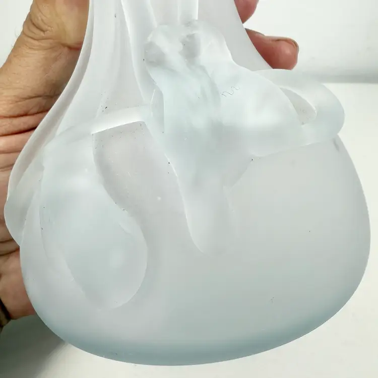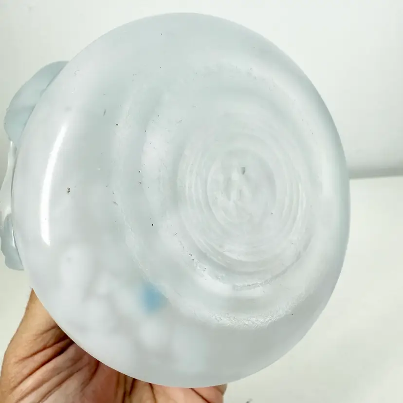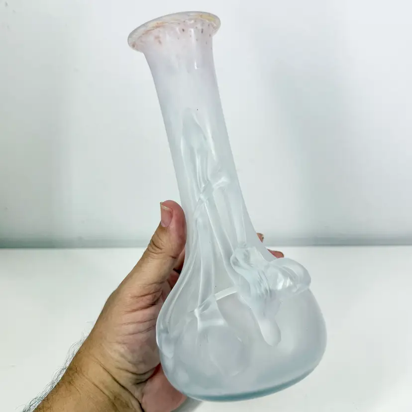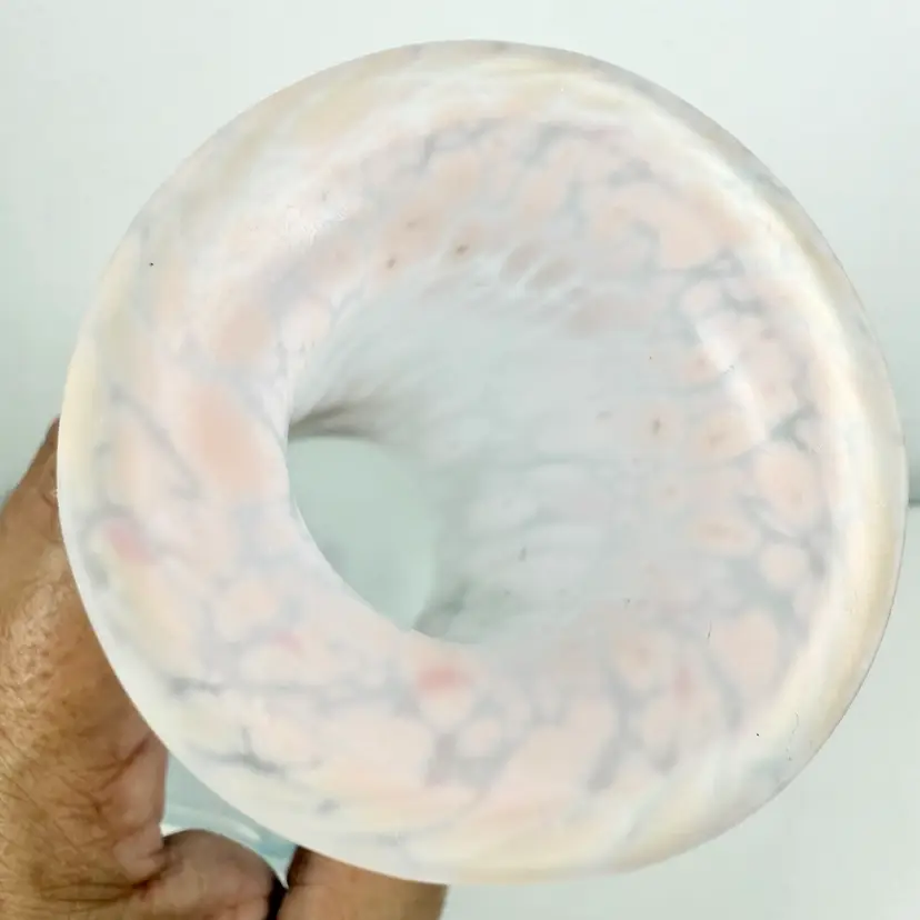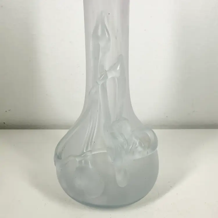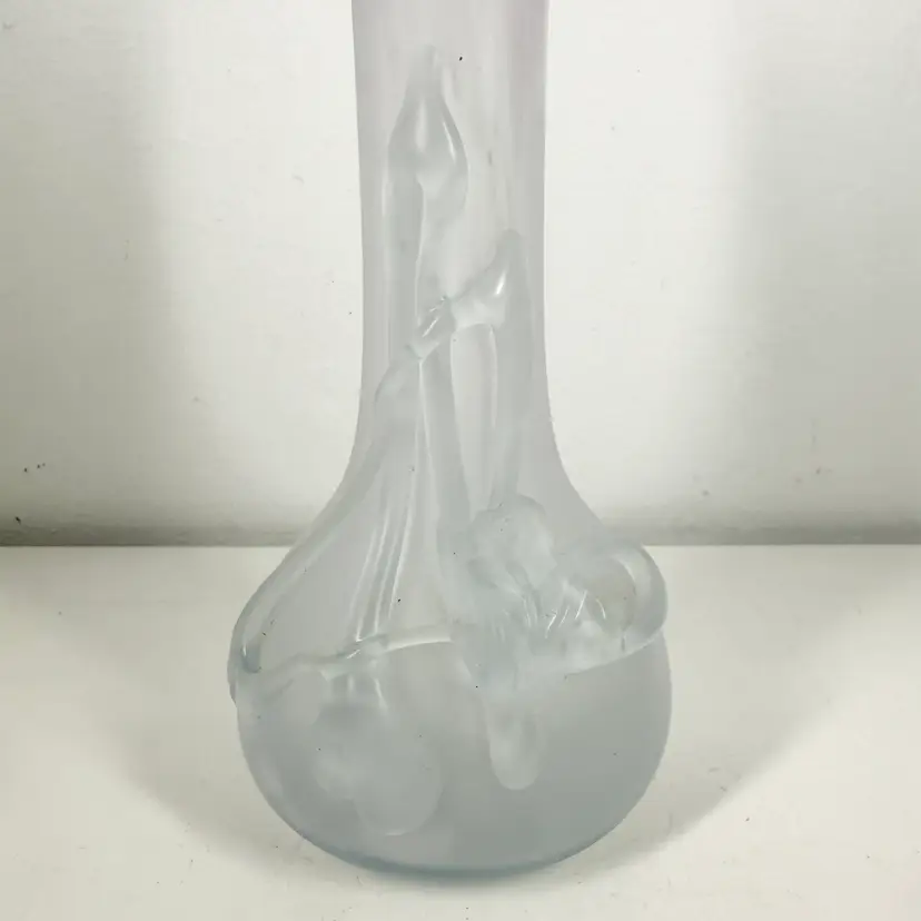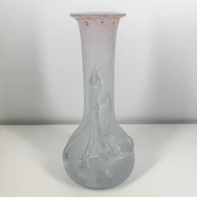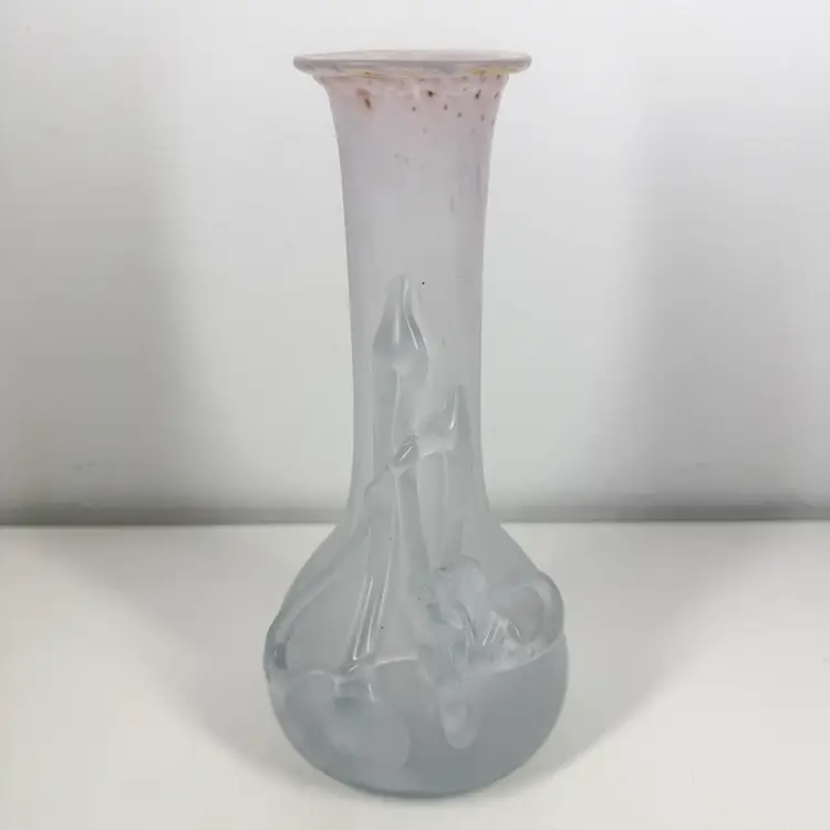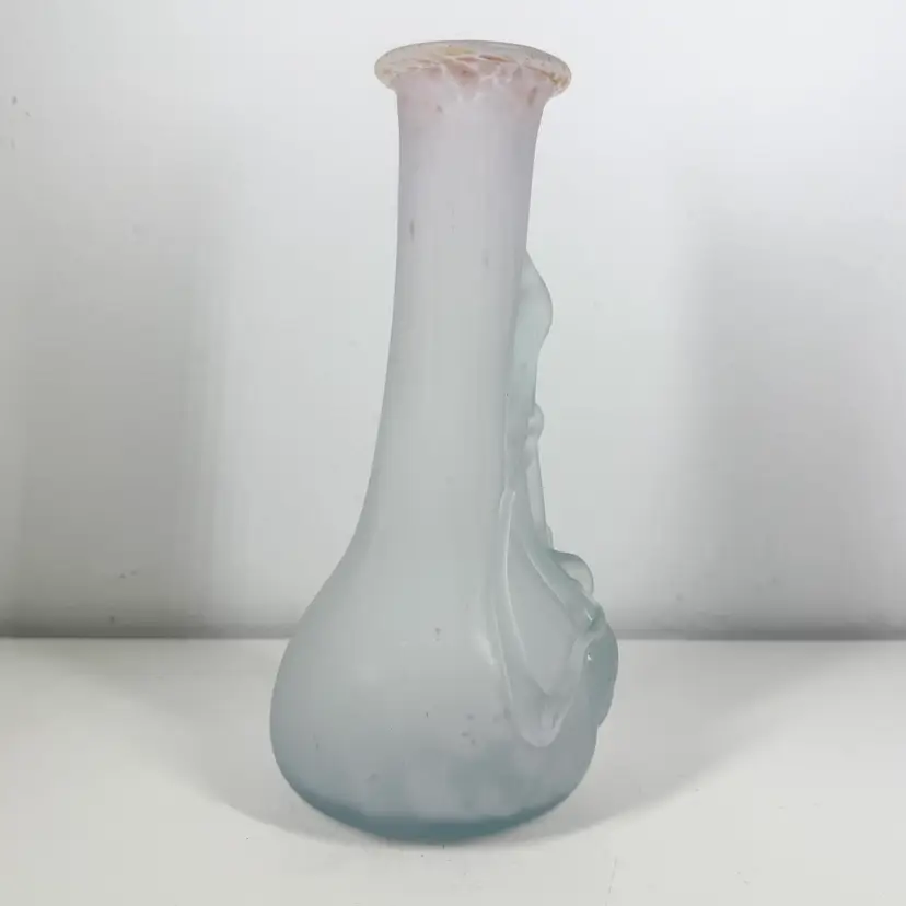 Frosted gradient glass from lavender to pink with subtle pattern and Art Nouveau applied leaf. In fantastic condition.