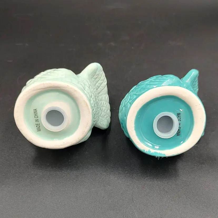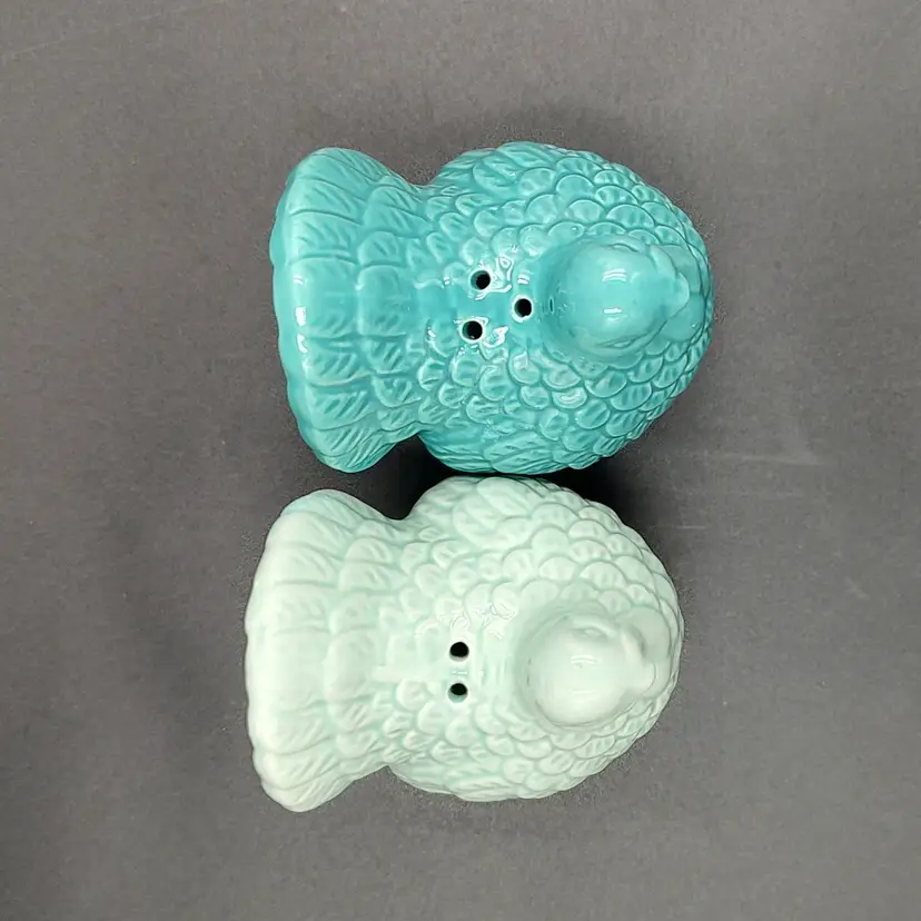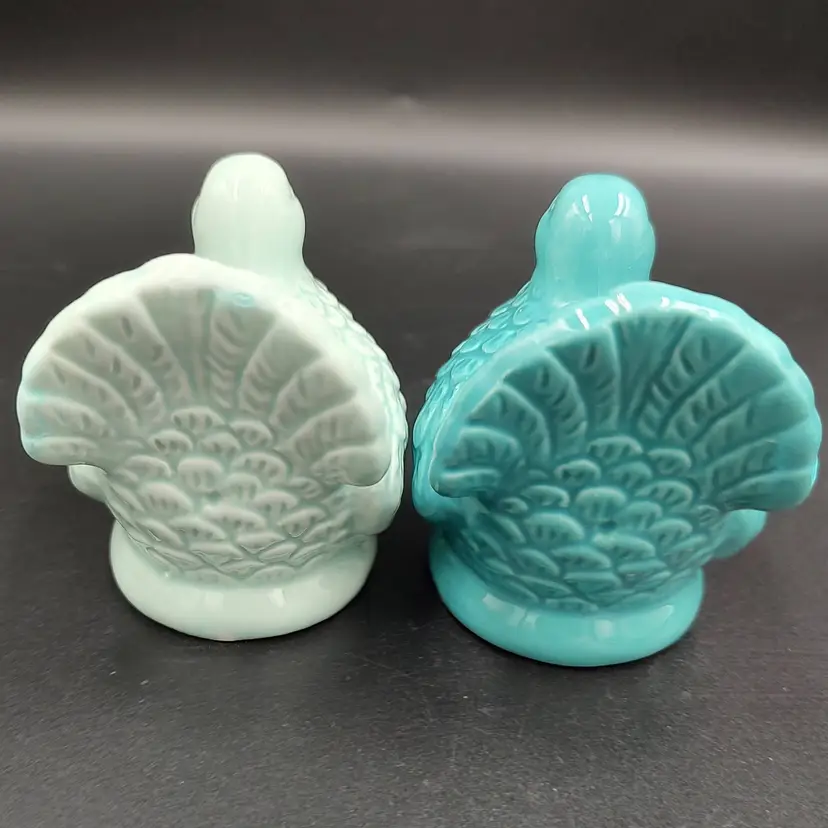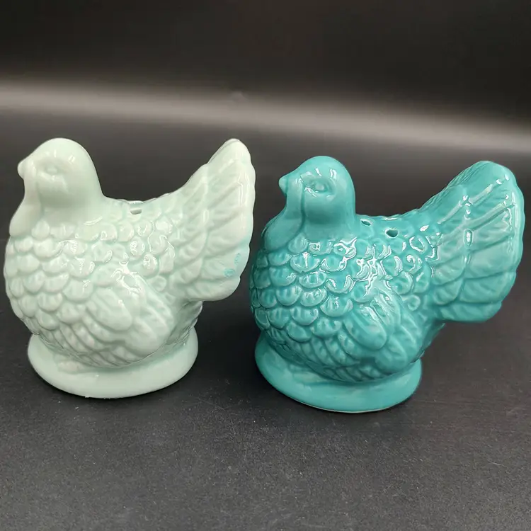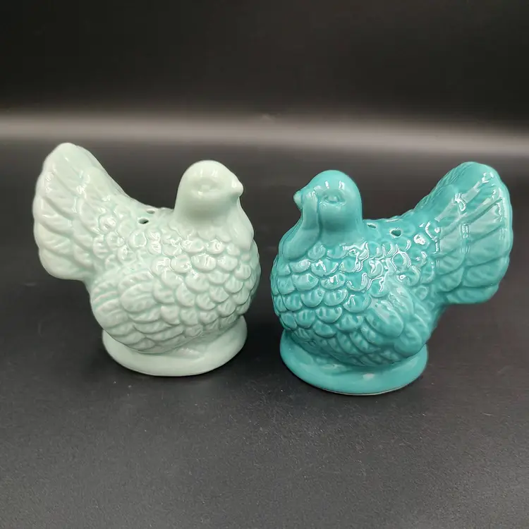 Contemporary Teal Ceramic Turkey Salt and pepper shakers. Chips have been painted. Height 3" x width 3" x length 2". Made in China