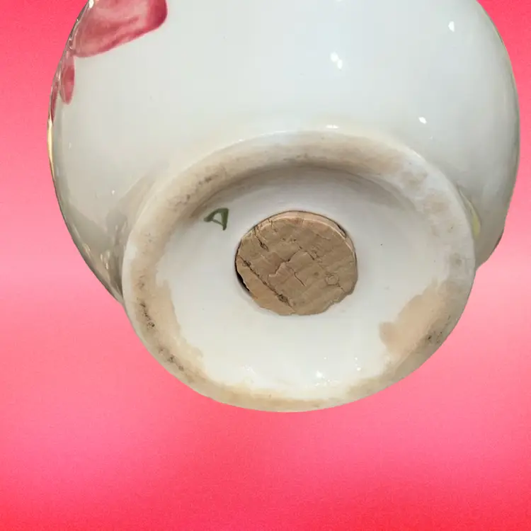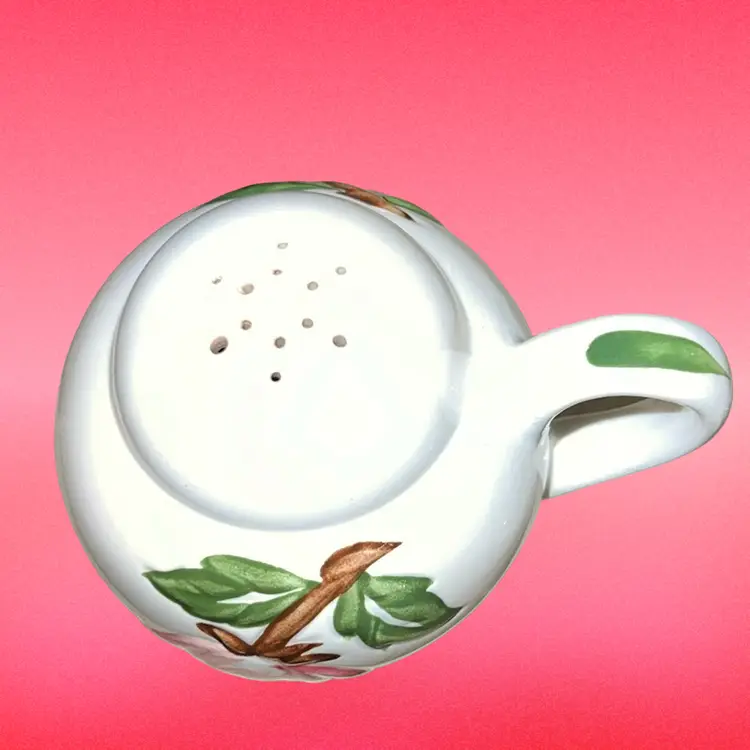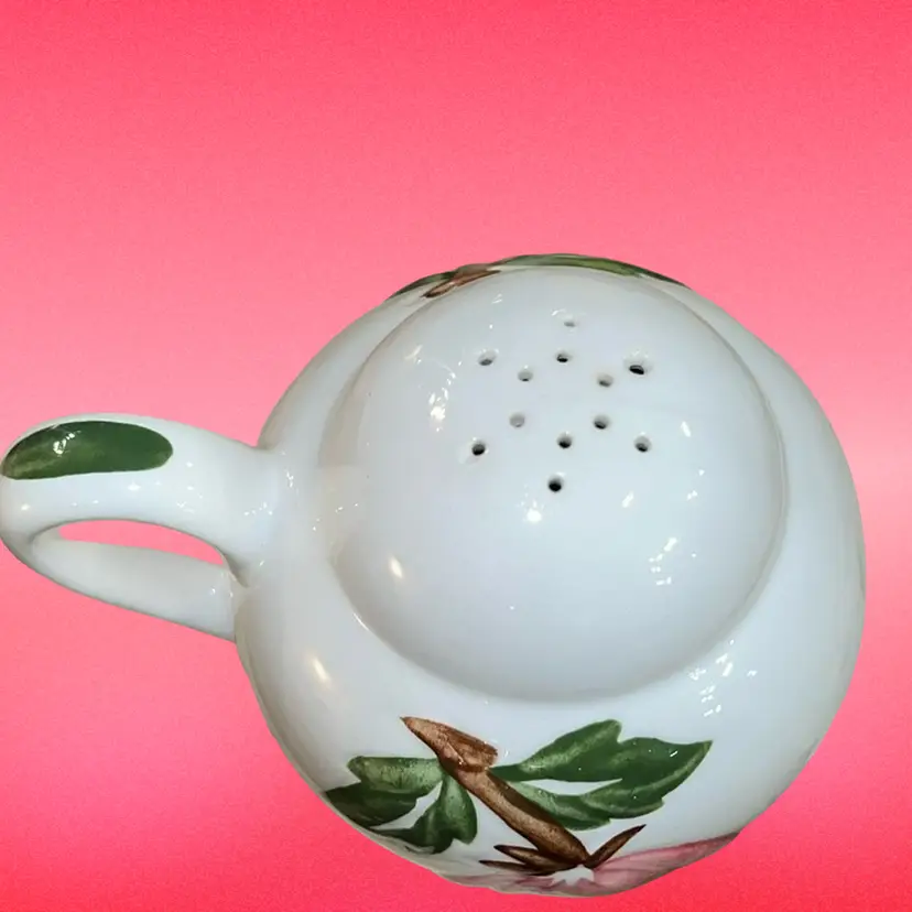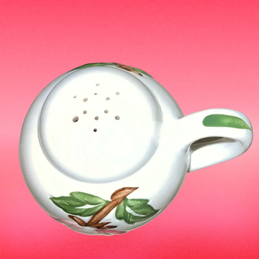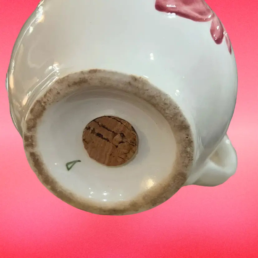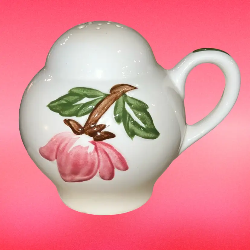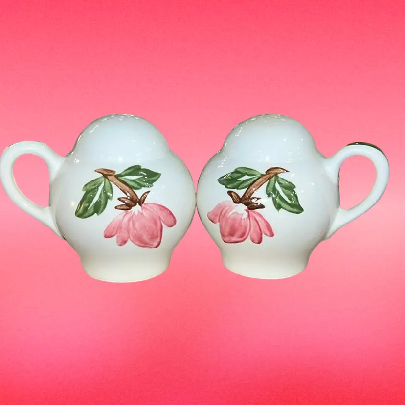 1940s round handpainted pair of salt & pepper shakers with handles. Cork stoppers intact. Green Arbor fuchsia floral design on both sides. 4.75”H 5”W. Excellent shape.