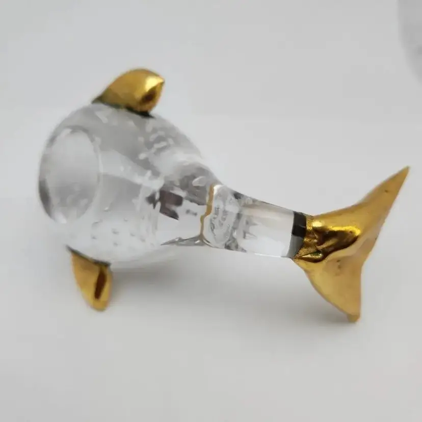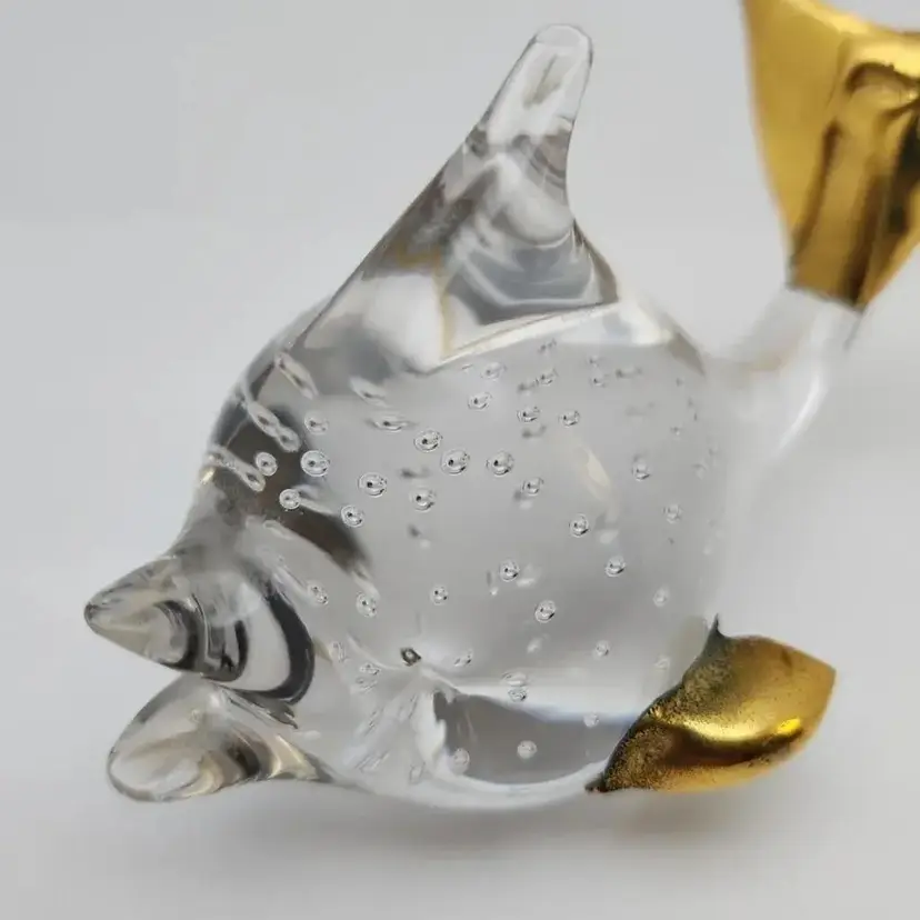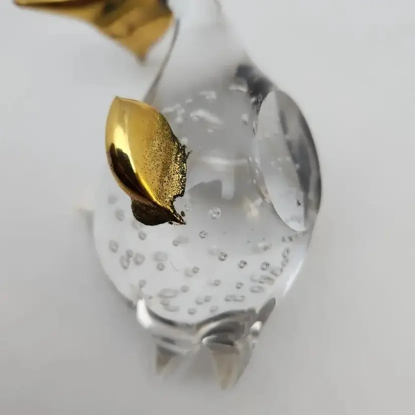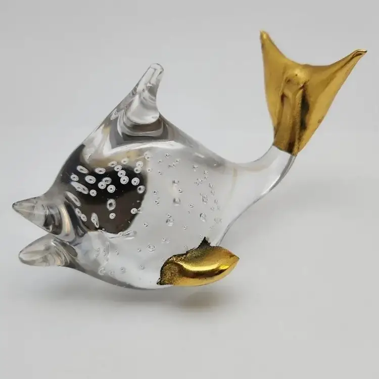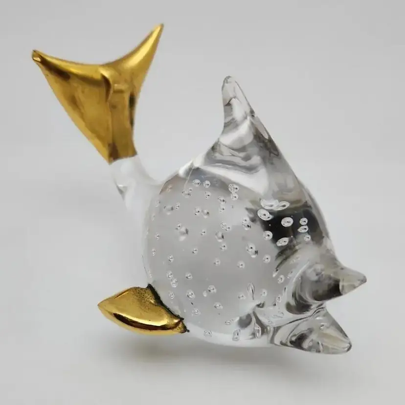 This lovely fish is about 4.25" x about 2.75" x about 2.75" high. it weighs about 9oz. The fins and tail appear to be made of a brass color metal. I cannot tell if it is an actual metal or if it is a brass paint.