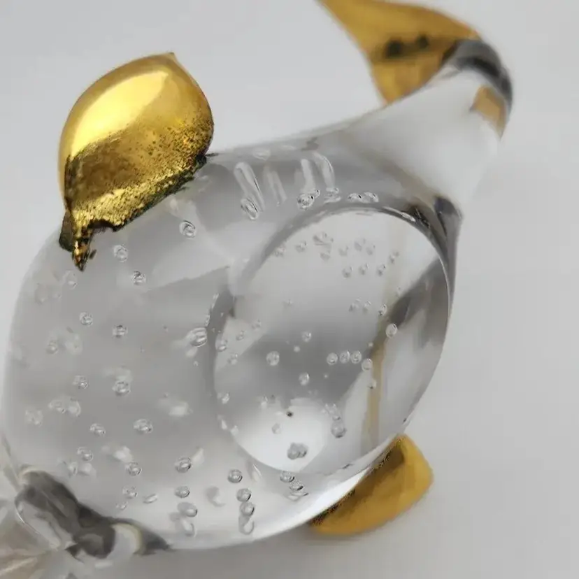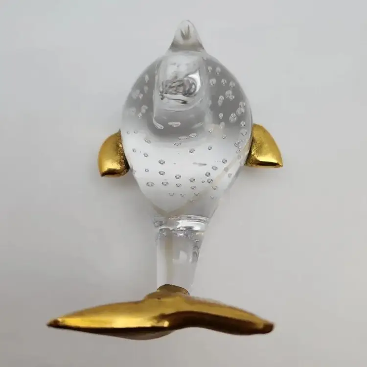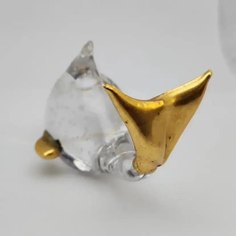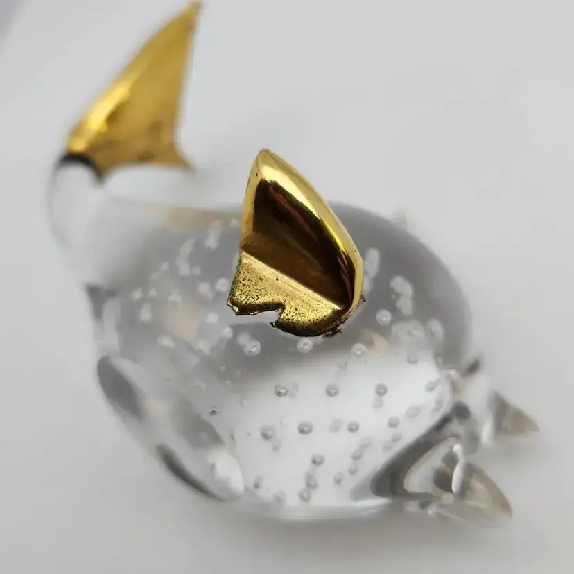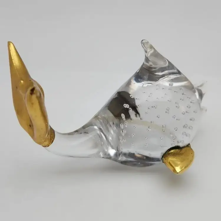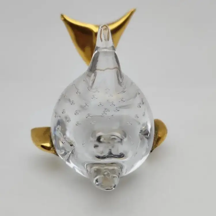 This lovely fish is about 4.25" x about 2.75" x about 2.75" high. it weighs about 9oz. The fins and tail appear to be made of a brass color metal. I cannot tell if it is an actual metal or if it is a brass paint.