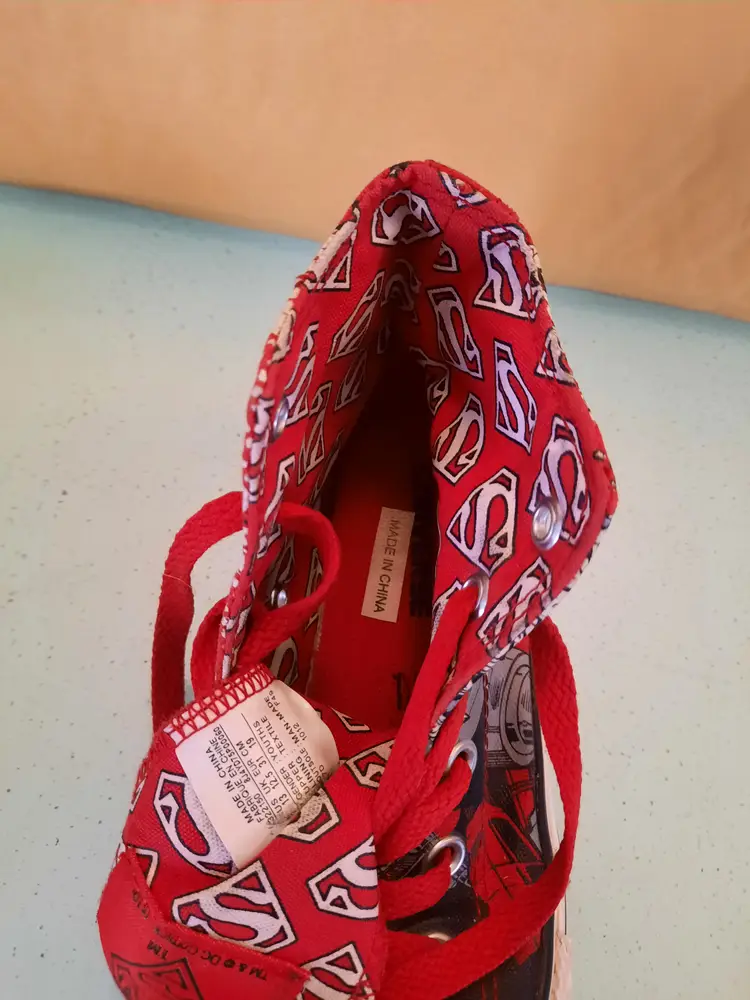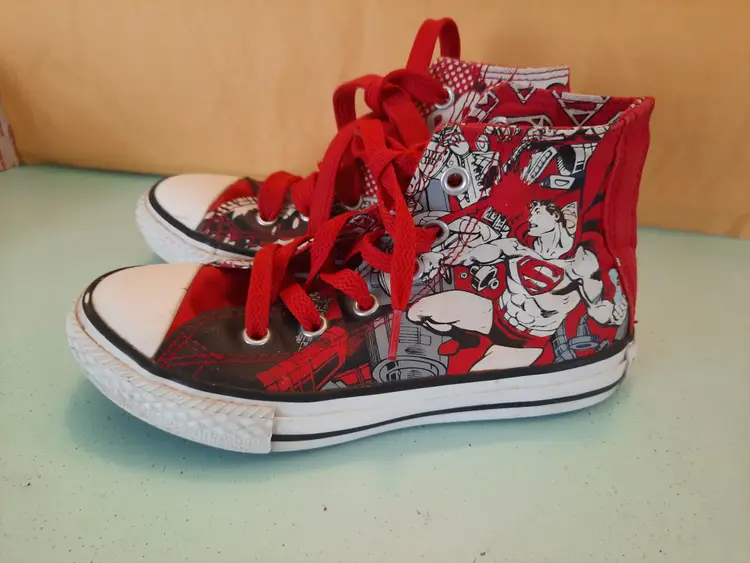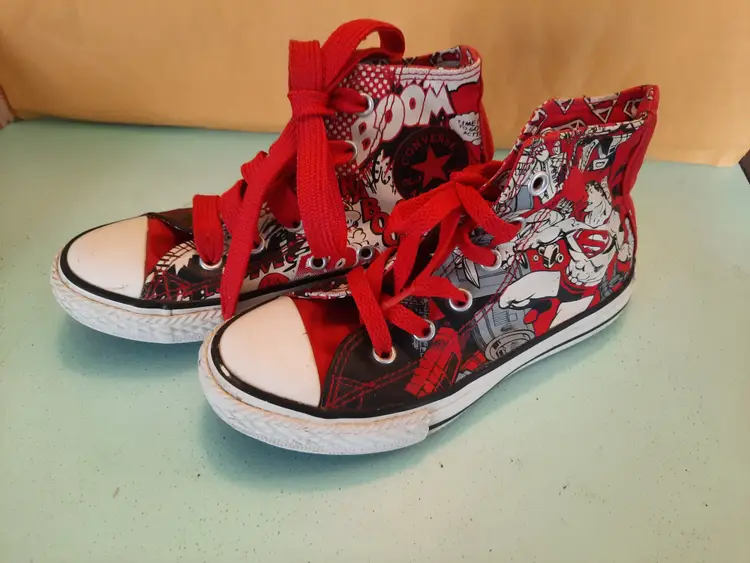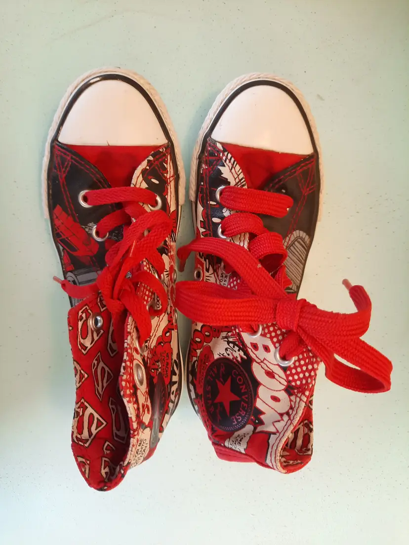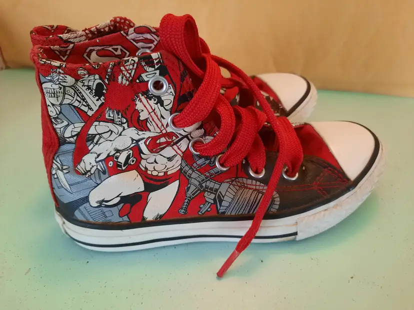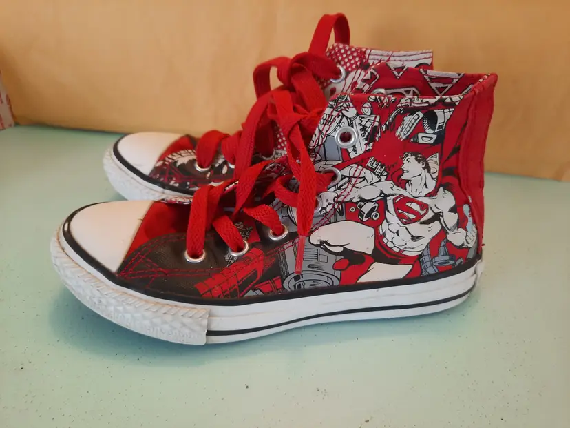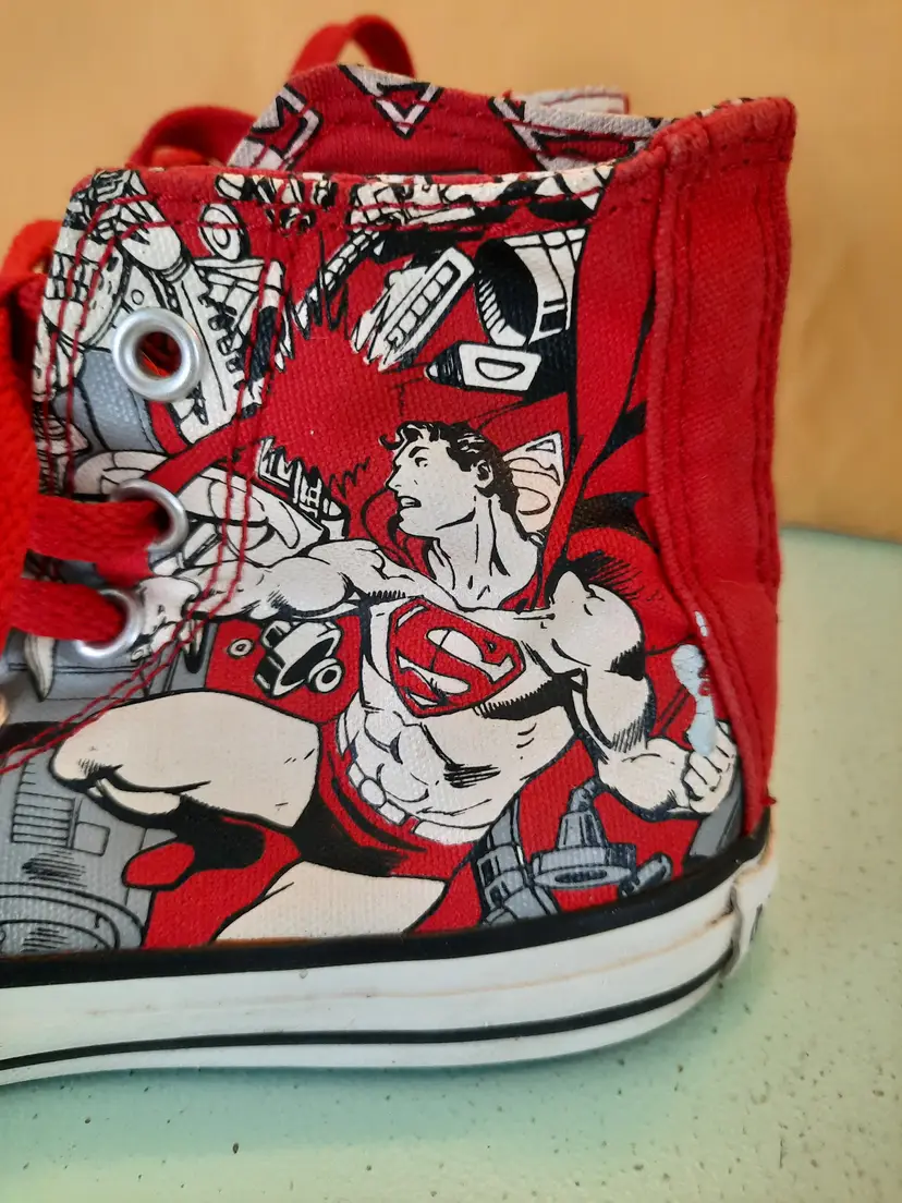 Converse X Superman All Star DC Comics Chuck Taylor hi-top sneakers. Bright and explosive print in the popular comic book character "Superman". Reunited in 2010, Converse and DC Comics created an amazing collection for fans of sneakers and comic books. Youth size 13. In very good pre-owned condition. Laces are both red, but not matching in weight. A scarce pattern!