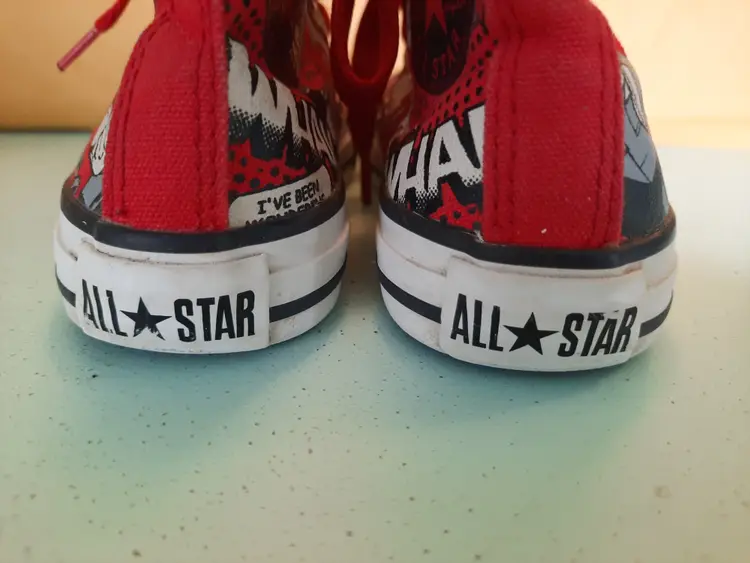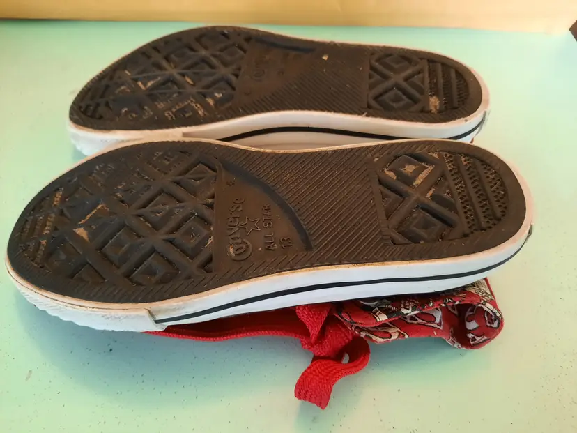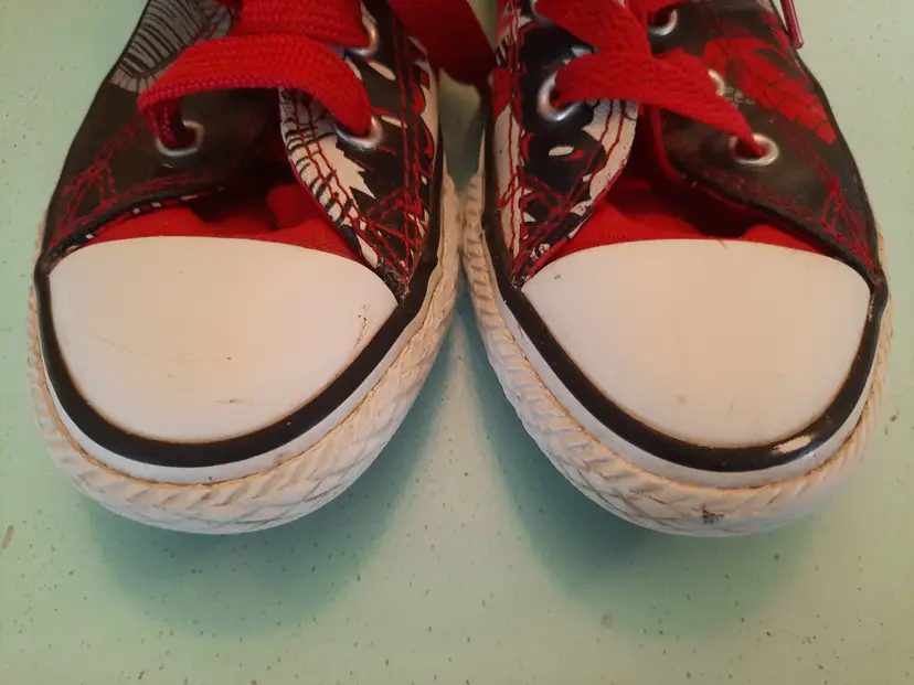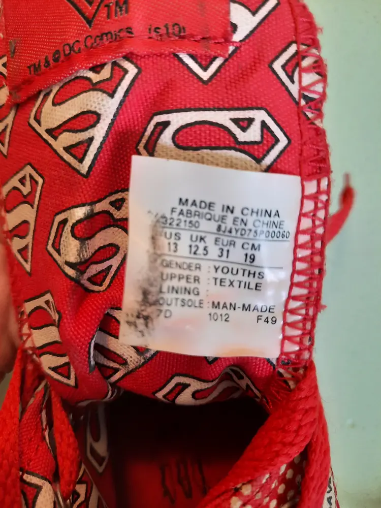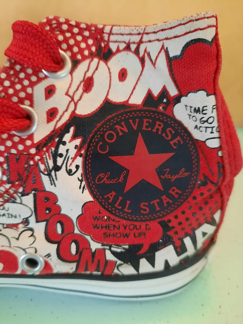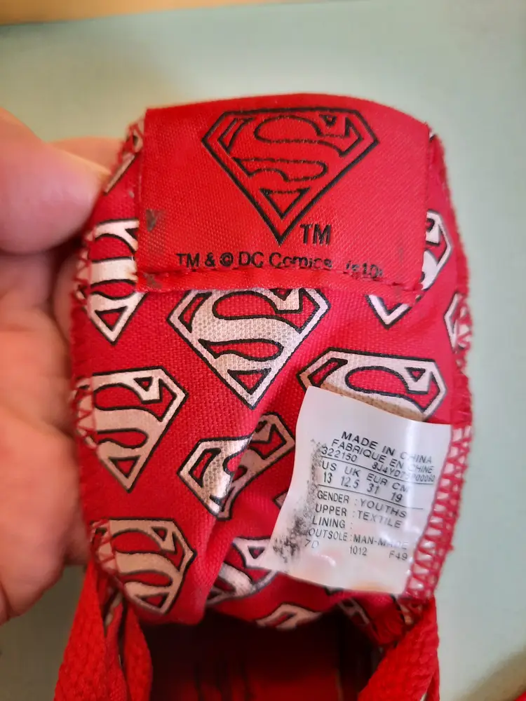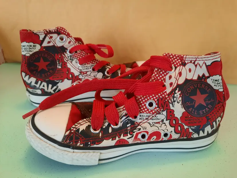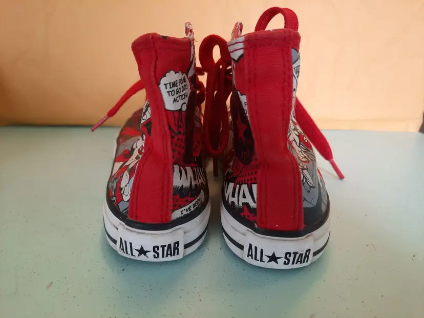 Converse X Superman All Star DC Comics Chuck Taylor hi-top sneakers. Bright and explosive print in the popular comic book character "Superman". Reunited in 2010, Converse and DC Comics created an amazing collection for fans of sneakers and comic books. Youth size 13. In very good pre-owned condition. Laces are both red, but not matching in weight. A scarce pattern!