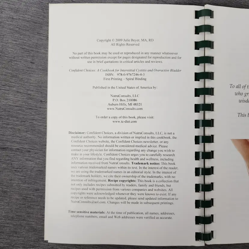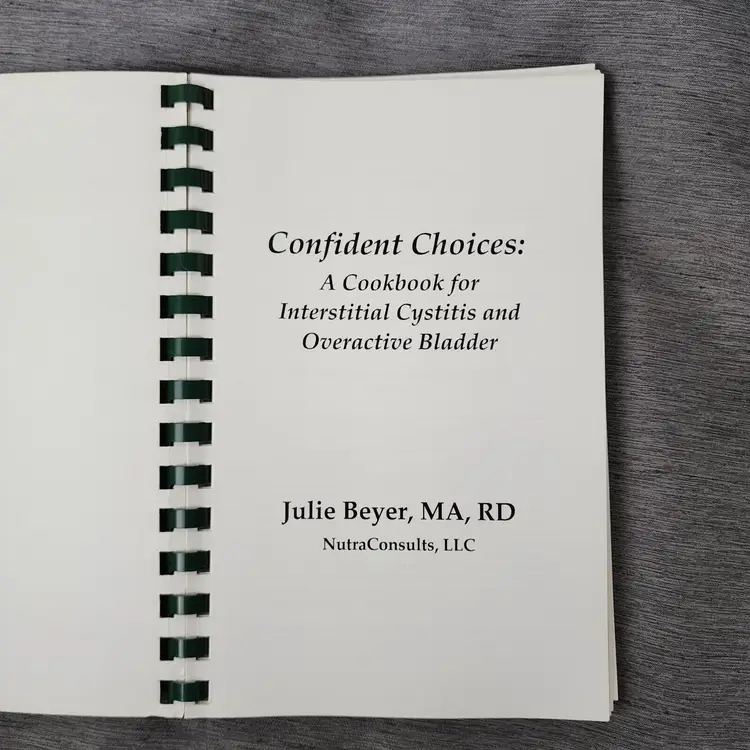Book Title: Confident Choices : Cookbook for Interstitial Cystitis Narrative Type: Nonfiction Original Language: English Publisher: NutraConsults, LLC Edition: First Edition Publication Year: 2009 Type: Activity Book Format: Paperback Language: English ISBN: 9780976724643 Author: Julie Beyer Features: Spiral Bound Genre: Cookbooks Topic: Baking, Classic Recipes, Cooking, Desserts, Food, Health, Nutrition, Soups, Home Cooking, Christmas Cookies, Comfort Food, Nostalgia, Side Dishes, Appetizers, Holiday Recipes, Thanksgiving Dinner, Family Gatherings Country/Region of Manufacture: United States