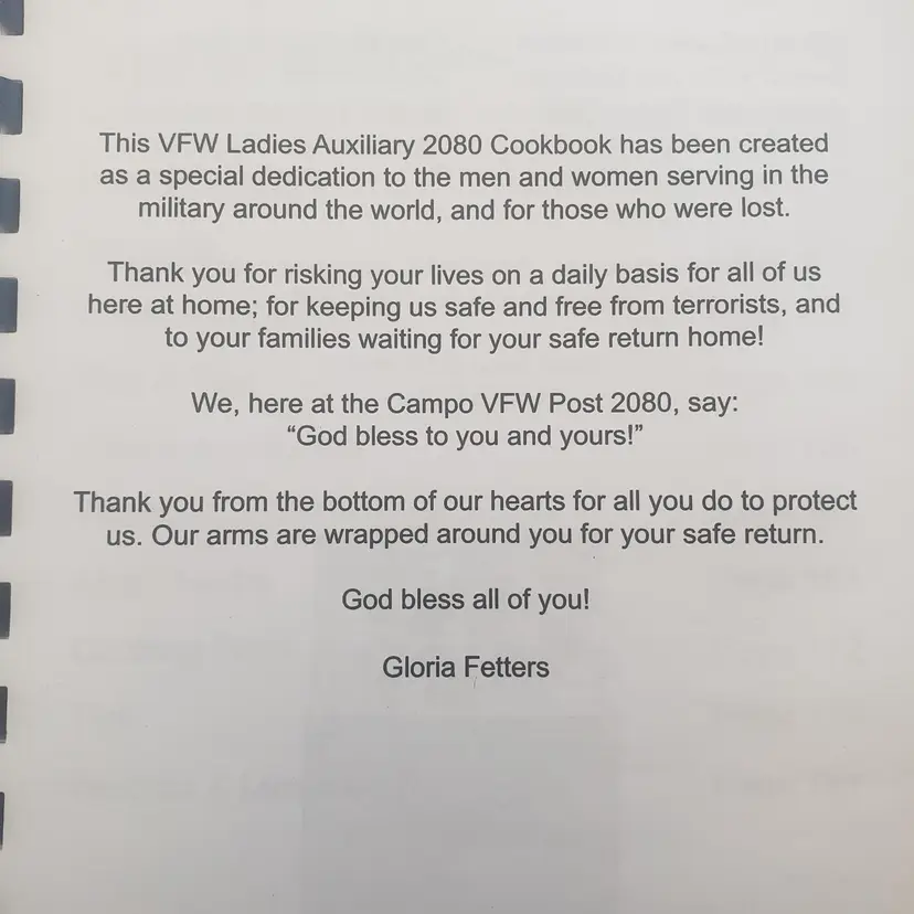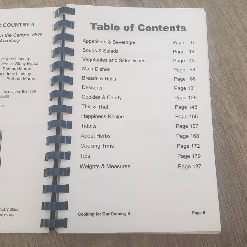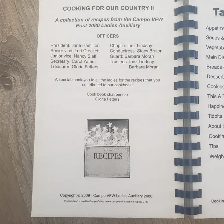 Cooking For Our Country II A Collection of Recipes By Campo, CA VFW Ladies Auxiliary 2080. Used Good Condition. No rips or tears. Published in 2009.