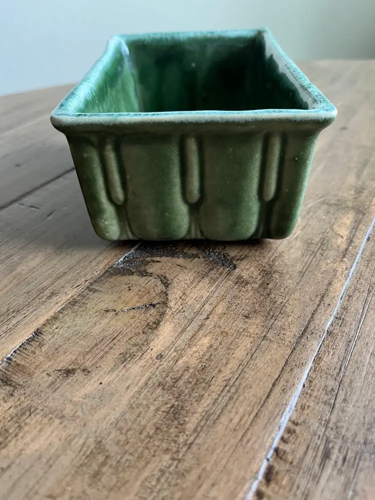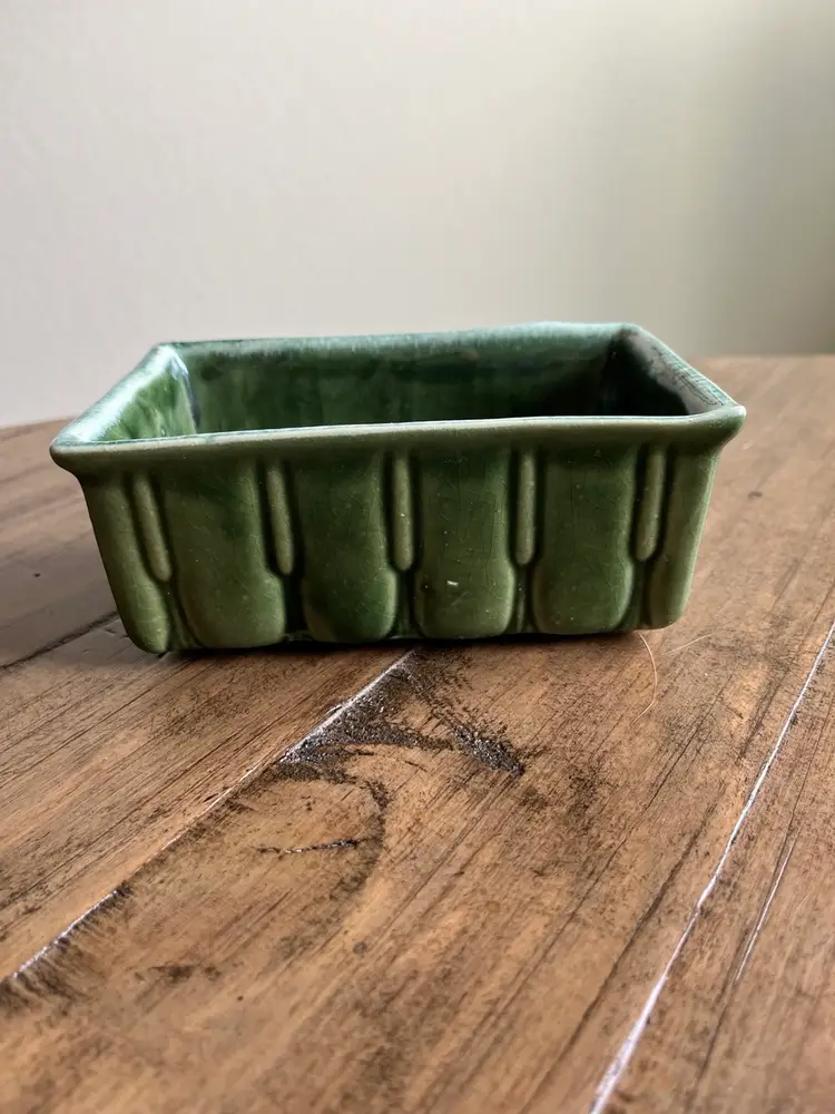 Vintage Cookson Pottery Green Rectangular Planter #CP-3006 Measures 6" long by 3 3/4" wide and 2 1/2" deep Marked on bottom USA CP-3006 Has some small spots where the glaze bubble popped durinng firing which is common in this type of pottery. Please see photos as they are part of the descripion