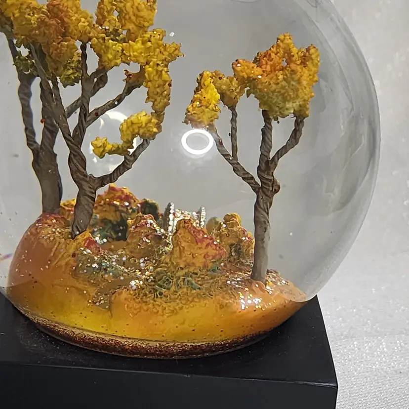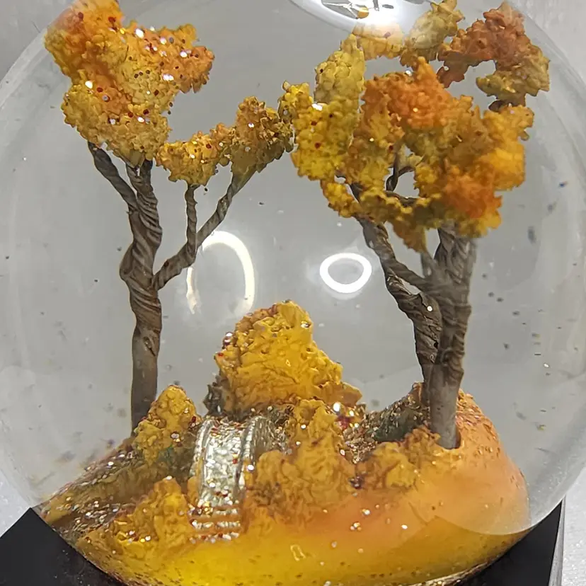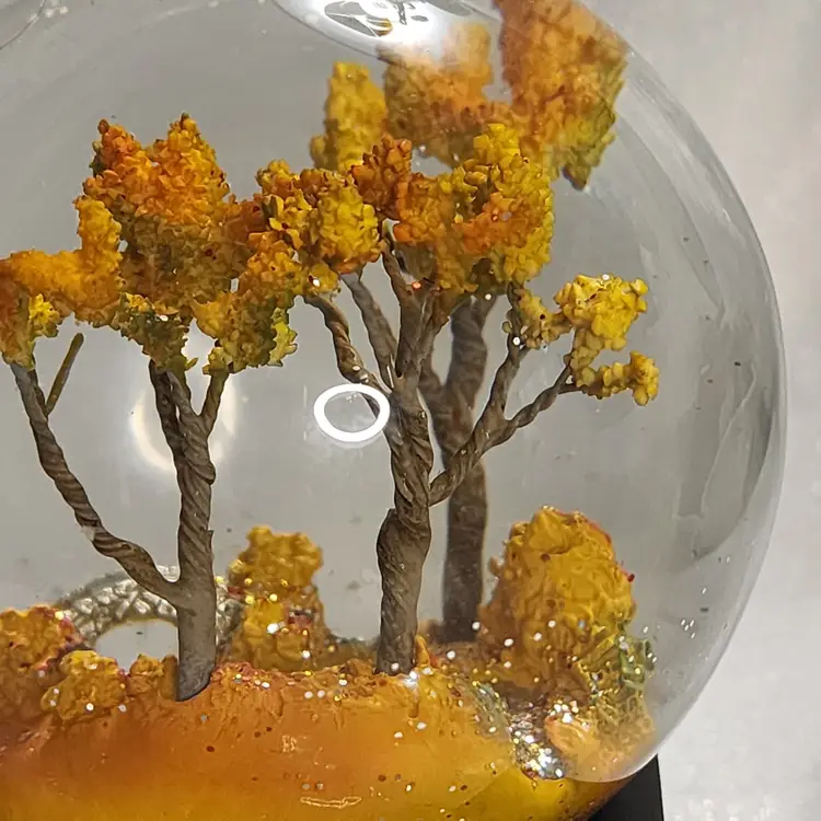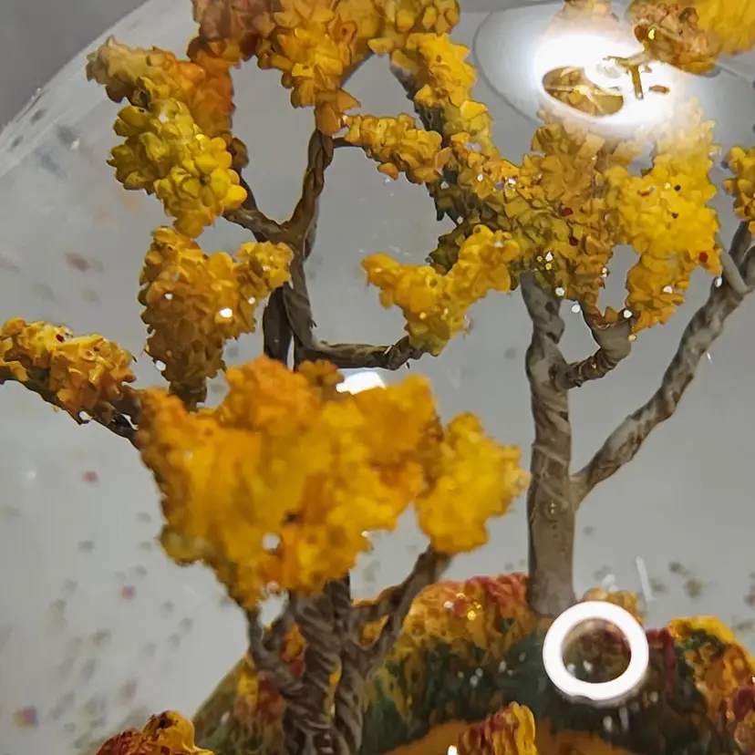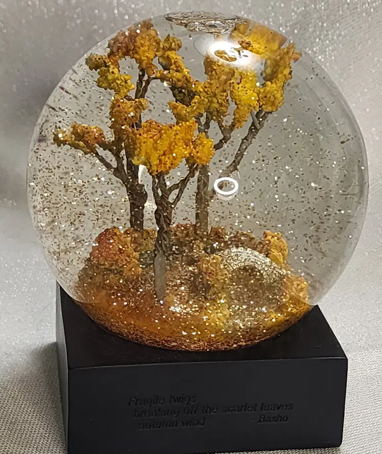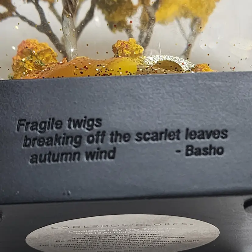 Autumn Fall themed snow globe with a stone bridge, trees with gold leaves, red silver & gold glitter. Inscription on one side of the base reads " Fragile Twigs breaking off the scarlet leaves autumn wind - Basho" Copyright 2013 CoolSnowGlobes