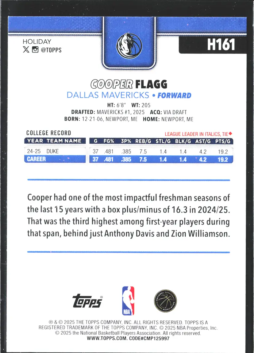 1st time buyer? Get $5 Off with code DISTRICT5 at checkout! Card as shown. All cards $20 and under ship PWE via lettertrackpro [https://www.letter-track.com/registerap.asp?AFID=8757] Set: 2025 Topps Holiday Card Number: RC Team: Dallas Mavericks Player/Athlete: Cooper Flagg Card Features: Rookie, Holiday Edition Sport: Basketball