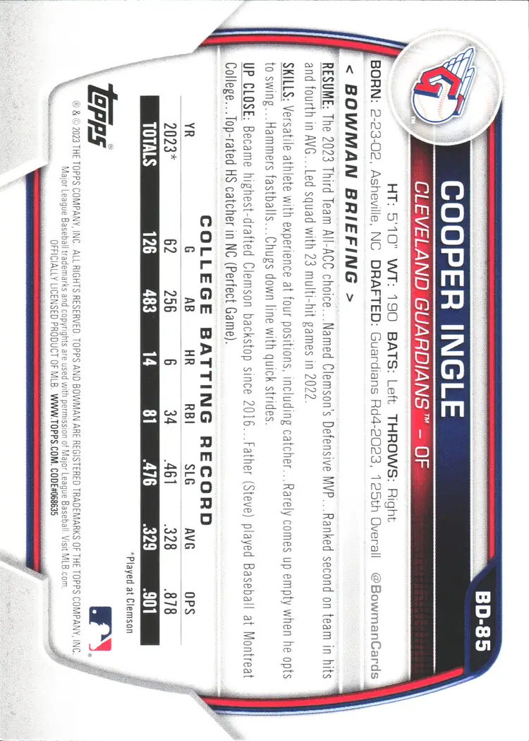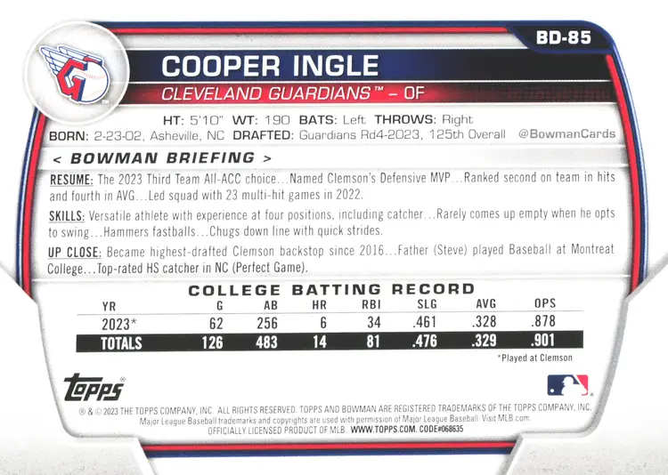1st time buyer? Get $5 Off with code DISTRICT5 at checkout! Card as shown. All cards $20 and under ship PWE via lettertrackpro [https://www.letter-track.com/registerap.asp?AFID=8757] Sport: Baseball Set: 2023 Bowman Draft Card Name: Cooper Ingle - Cleveland Guardians Card Number: BD-85 Player/Athlete: Cooper Ingle Team: Cleveland Guardians