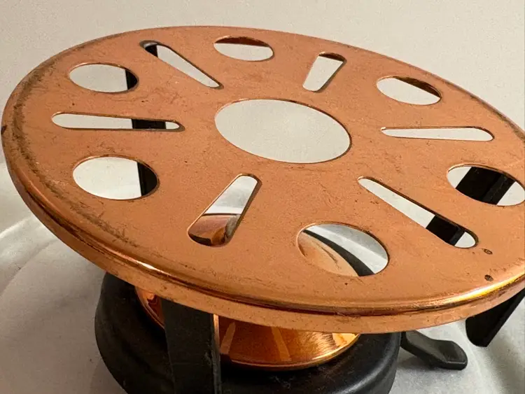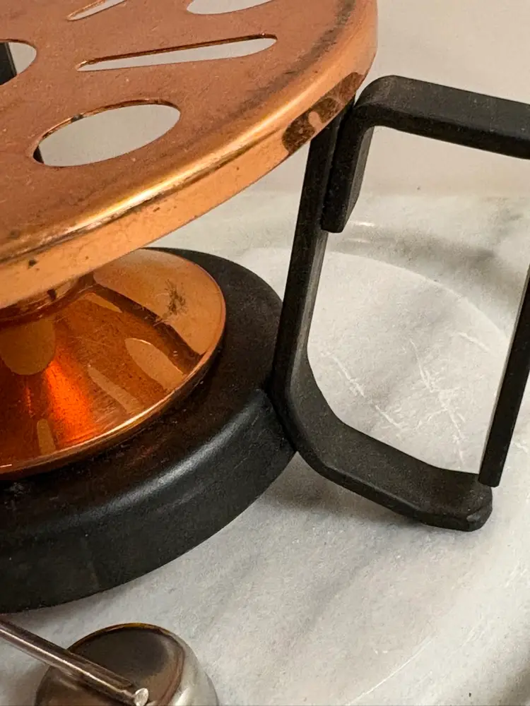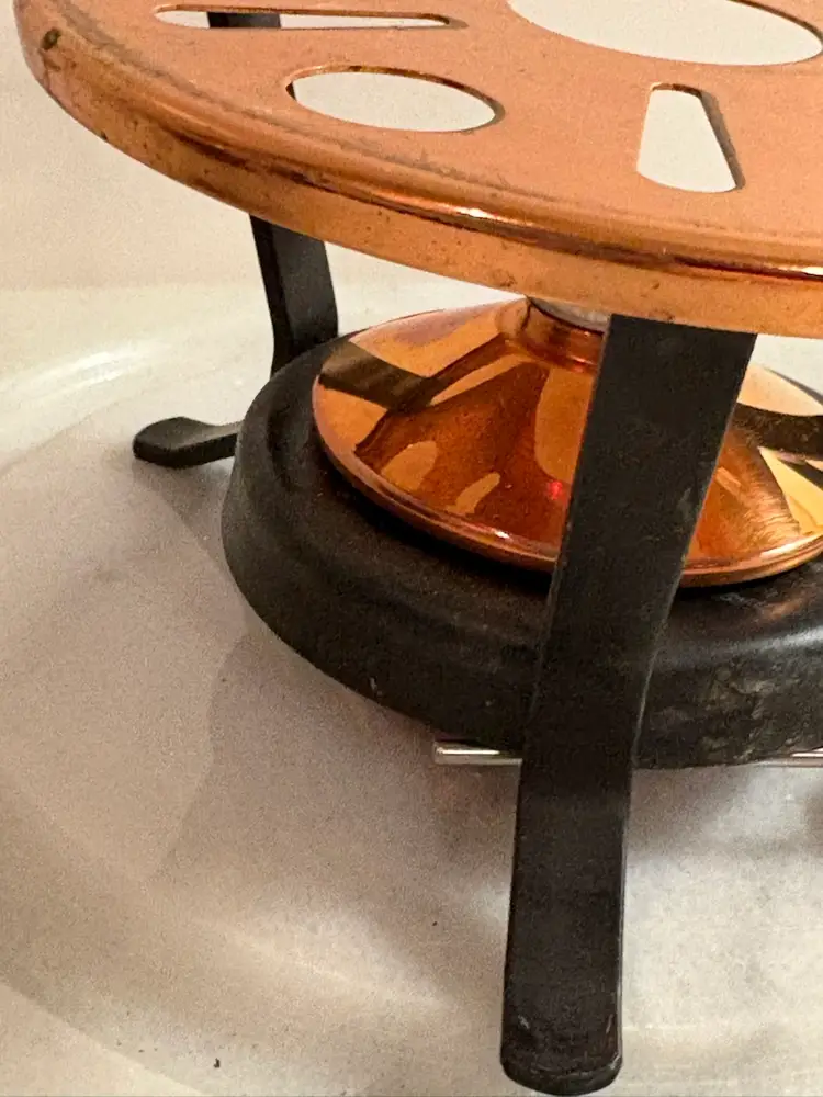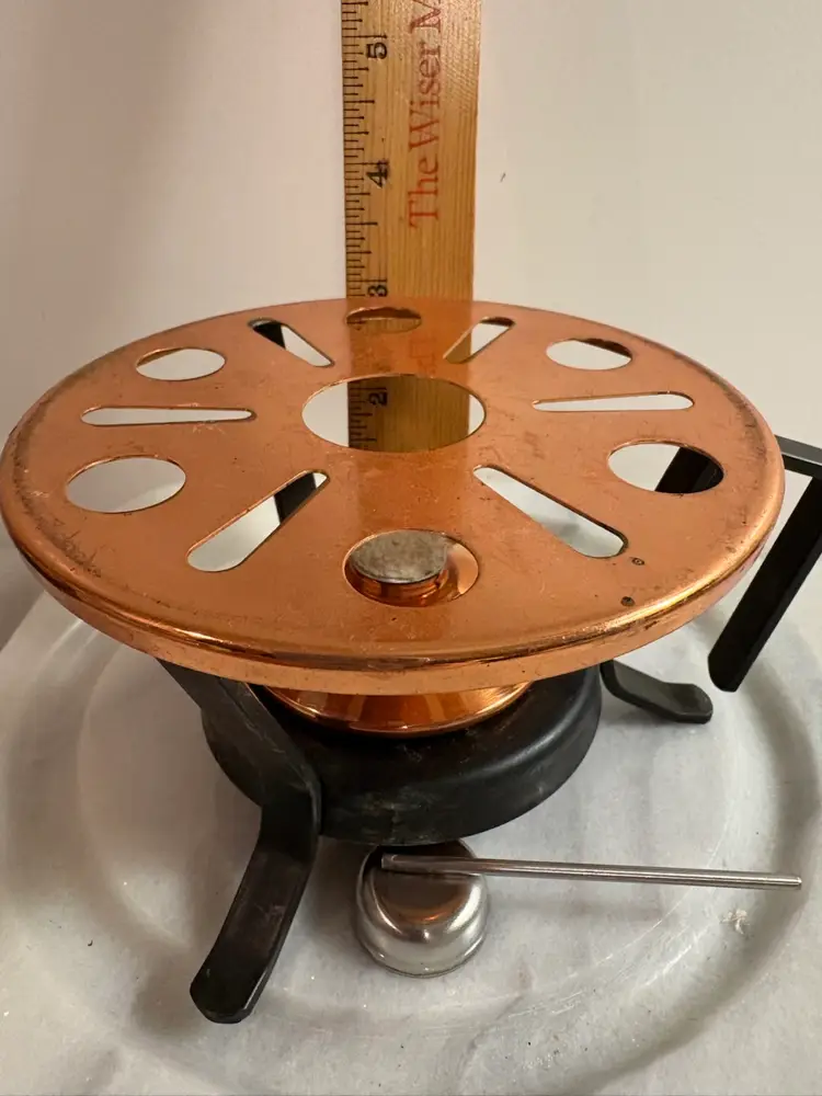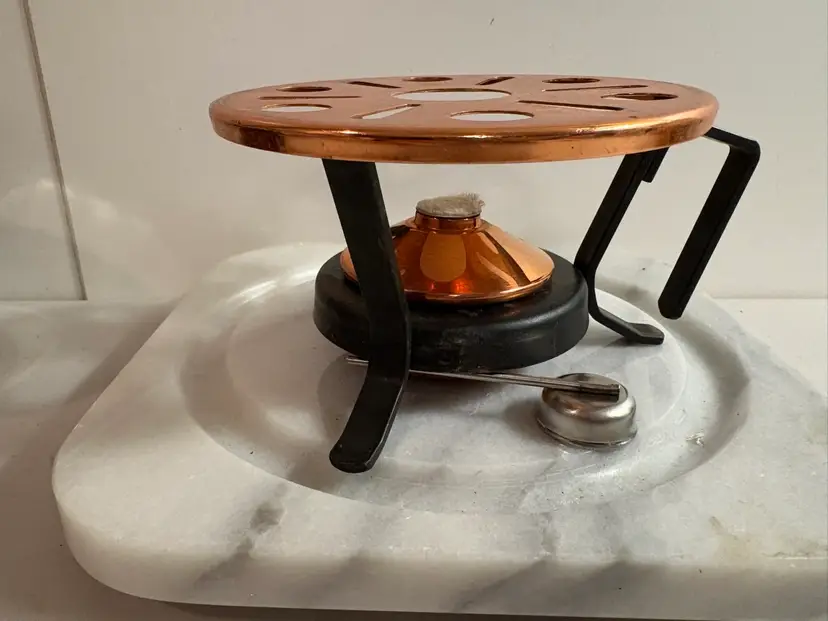 This product is a copper and iron tea or fondue warmer, featuring the high-quality material of copper. The combination of copper and iron adds durability and a classic touch to any kitchen or dining setting. This unique piece is sure to add a touch of elegance to any tea or fondue party, making it a practical and stylish addition to any collection.