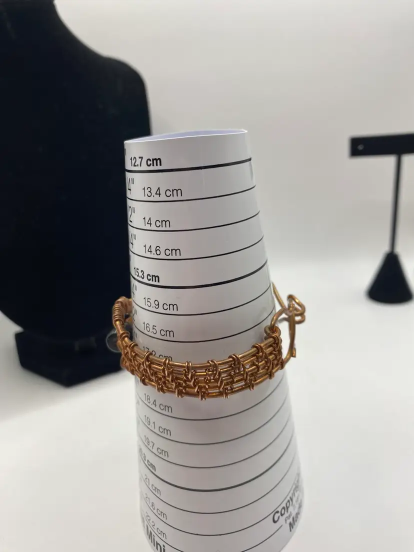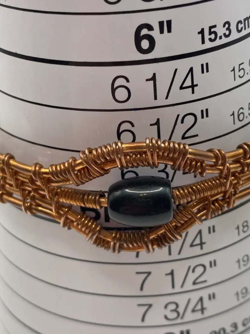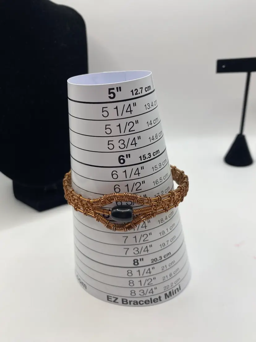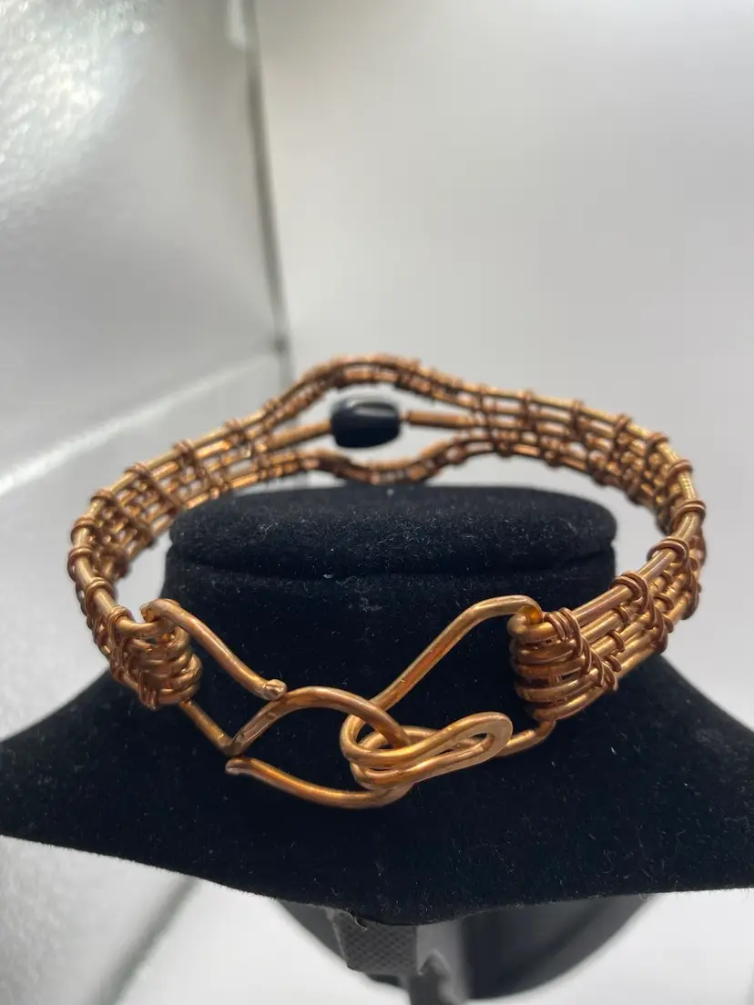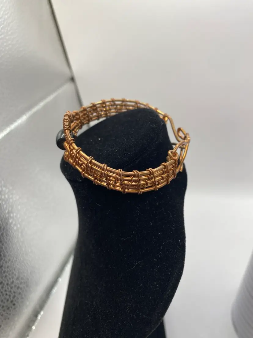 This handmade copper wire wrapped cuff bracelet is designed for women and men and features an oval shape with an adjustable hook closure for a customizable fit. The cuff style bracelet is adorned with a traditional black round stone and exudes a nature-inspired, bohemian, and ethnic charm. Made of copper metal, this bangle bracelet is both stylish and versatile, suitable for all occasions.