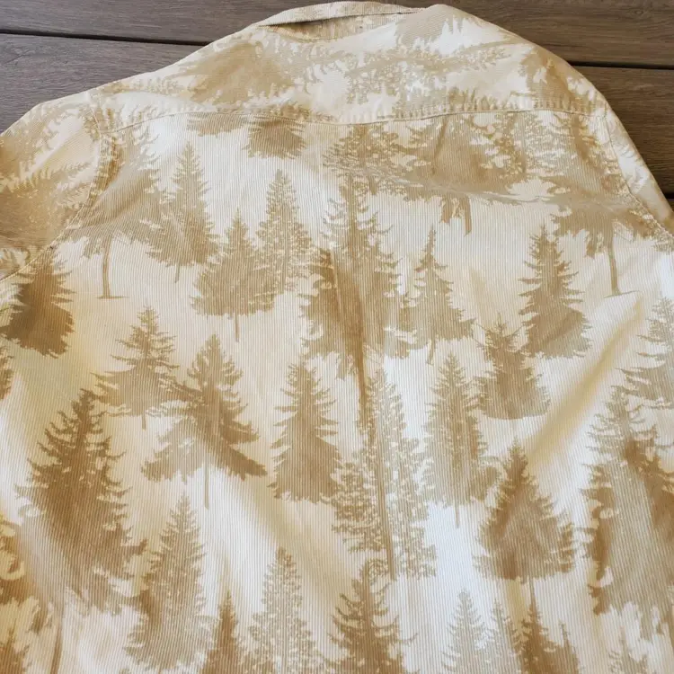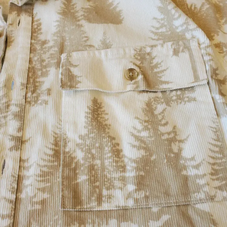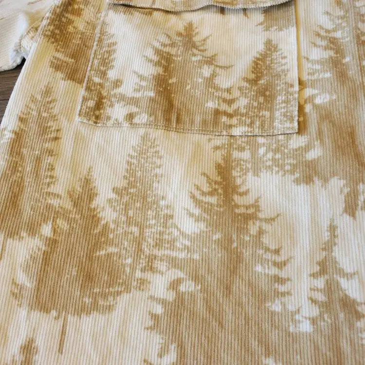 This stylish corduroy shirt is perfect for any occasion! With a beige and brown pine tree pattern, this shirt features a button-down collar and long sleeves with button cuffs. The two front pockets add a touch of practicality, while the heavyweight fabric makes it a great choice for winter.