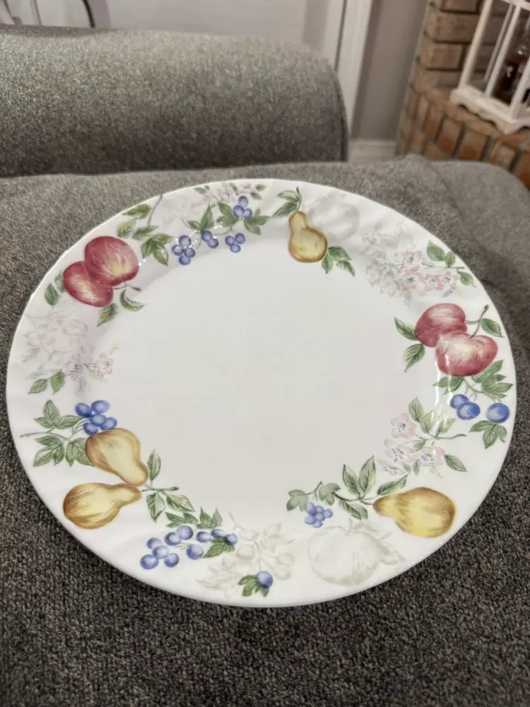 This is a Corelle “Chutney” dinner plate. This pattern features a border of apples, pears, & blueberries with green leaves & blossoms. The pattern was part of the Corelle Impressions line & was produced from approximately 2001-2018. The plates are made of tempered glass & is microwave & dishwasher safe.