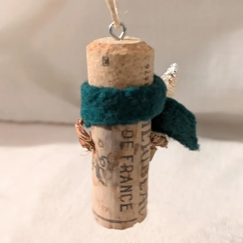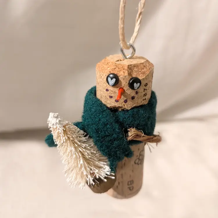 Add a touch of whimsy to your holiday decor with this handmade cork snowman ornament. Complete with a cozy scarf and a tiny tree, it's perfect for your Christmas tree or as a unique gift.