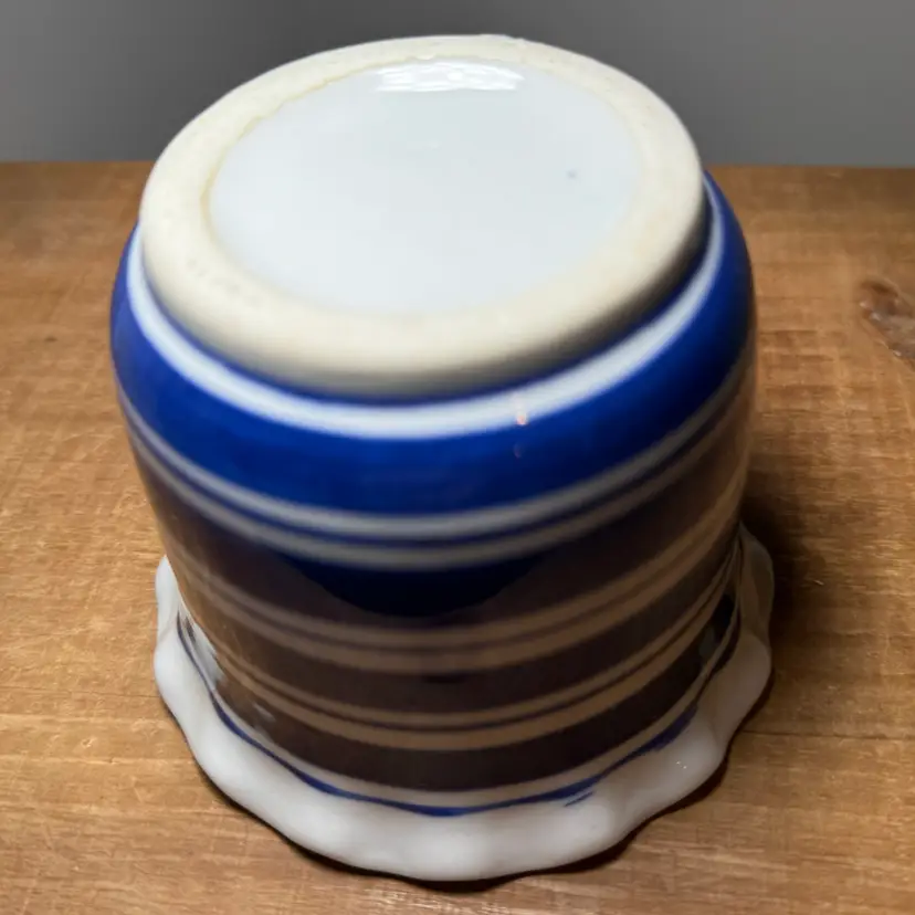 This charming small ceramic planter features the iconic Cornishware cobalt blue and white horizontal stripes. It is uniquely finished with a ruffled or scalloped rim, adding a soft decorative touch to the classic kitchenware design.