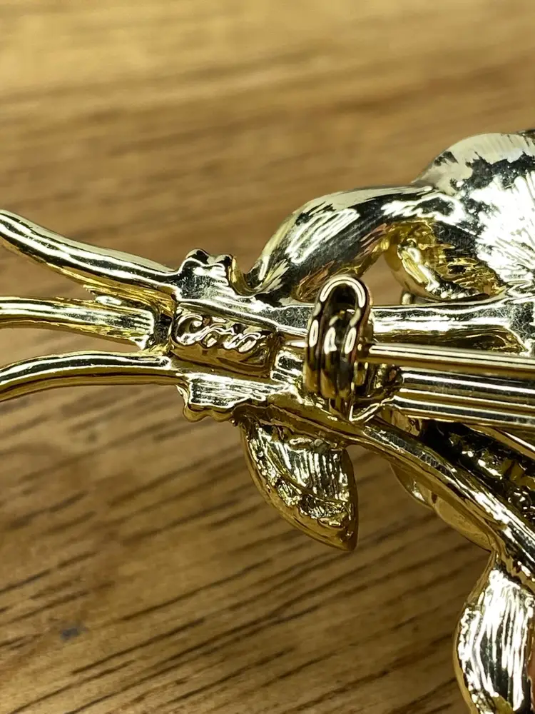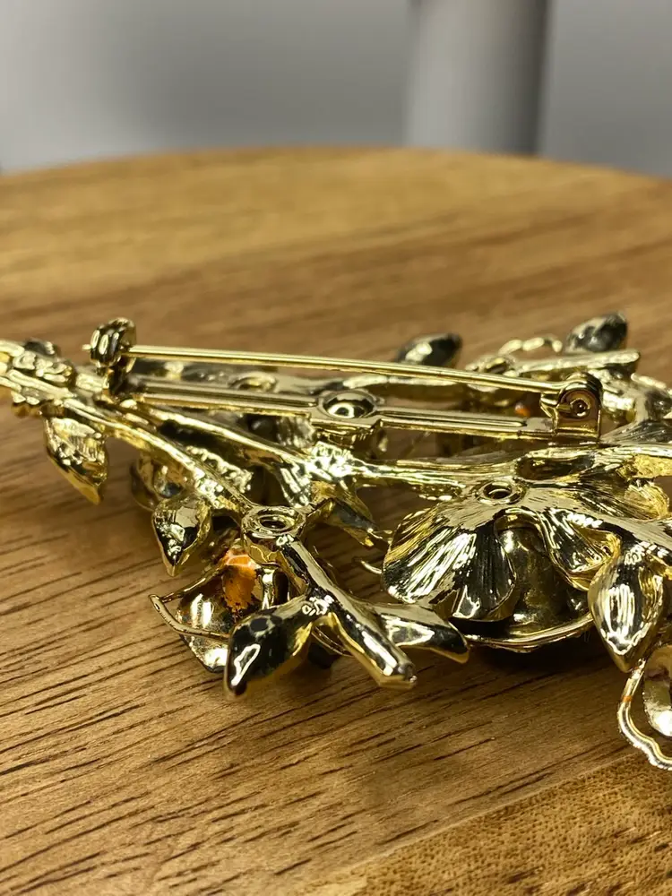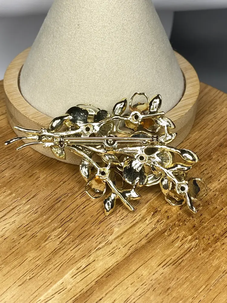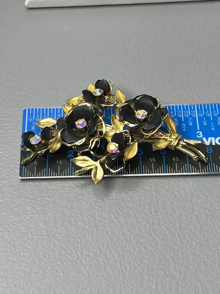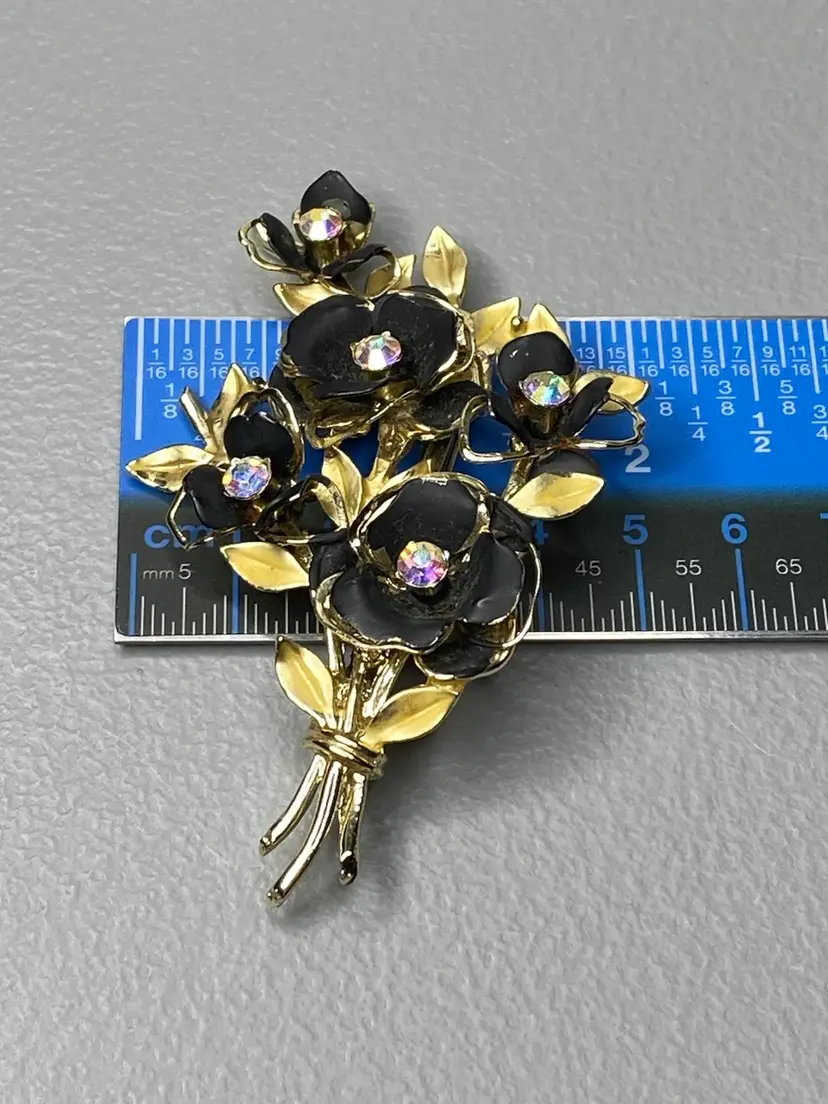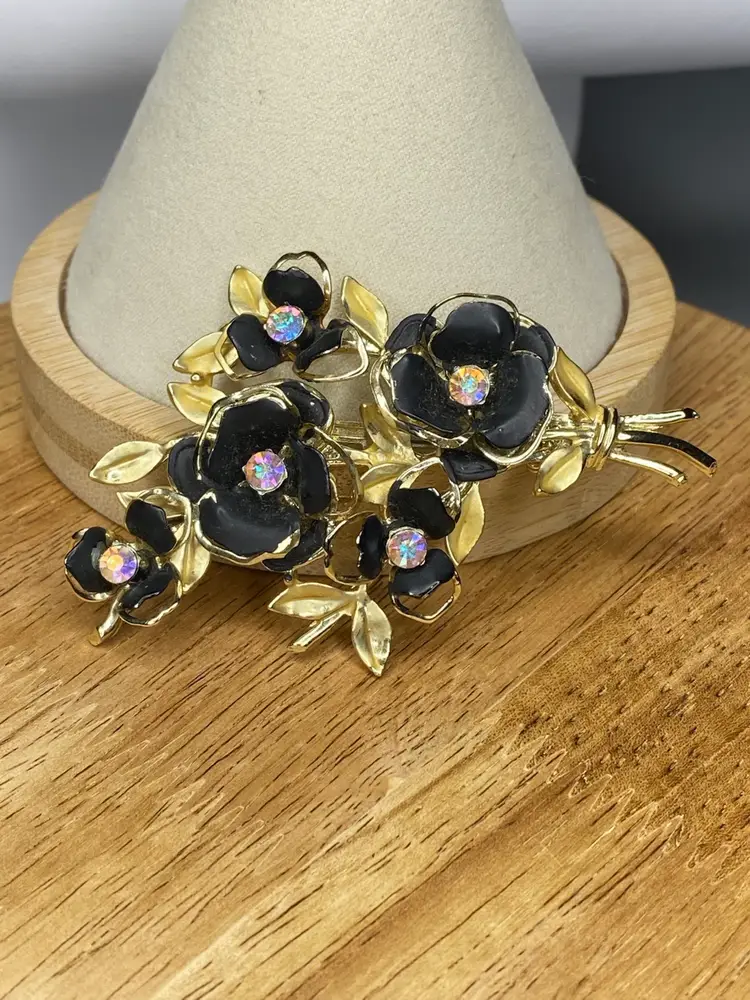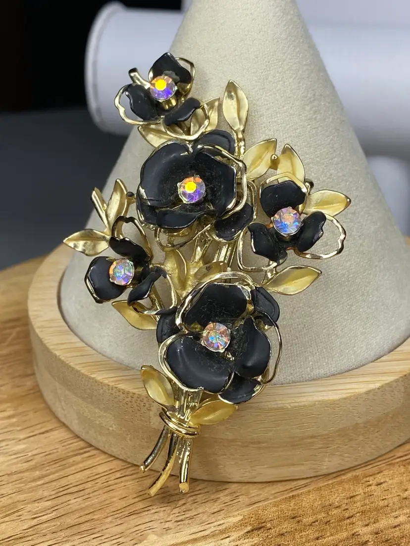 This elegant Coro brooch features beautifully crafted black enamel flowers arranged in a stunning floral bouquet design. The rhinestones in aurora borealis add a touch of sparkle to the piece, making it an ideal accessory for special occasions like weddings, graduations, and anniversaries. The brooch is pre-owned and has a vintage charm to it, with minimal signs of wear.