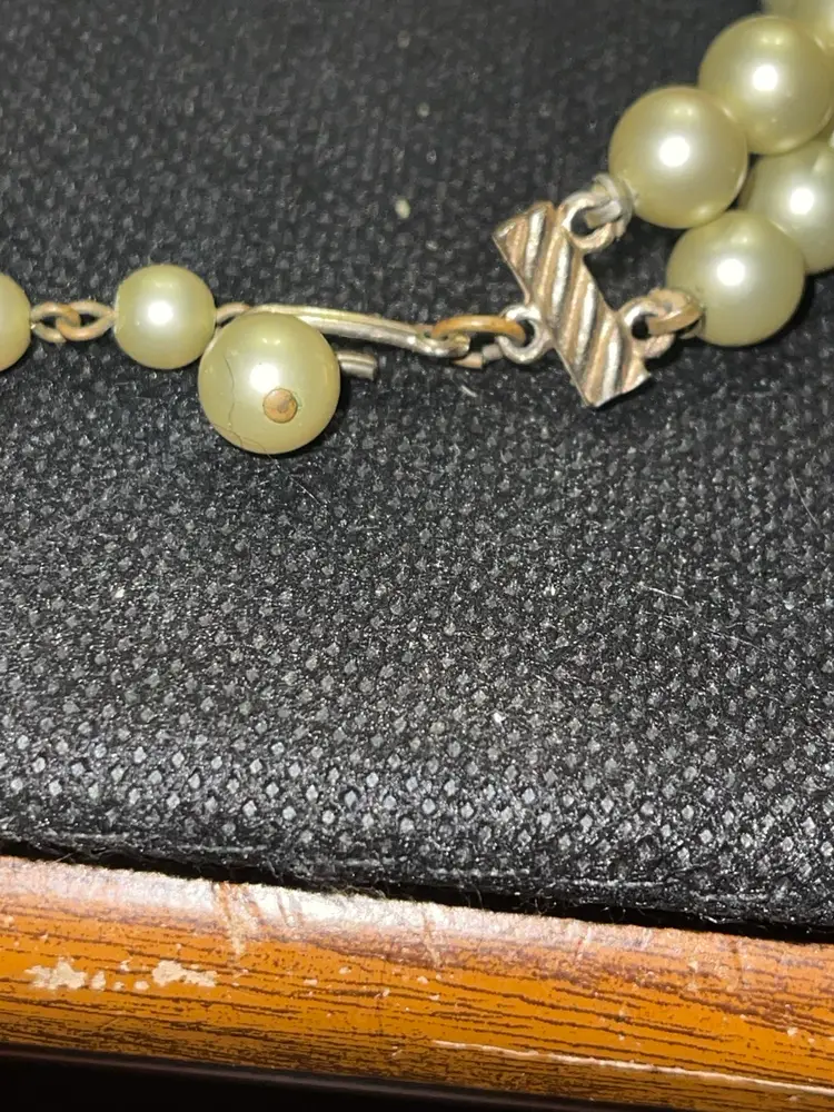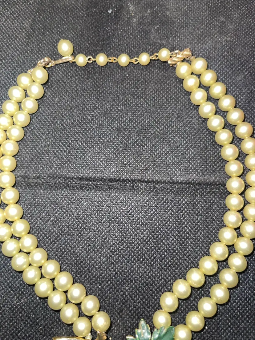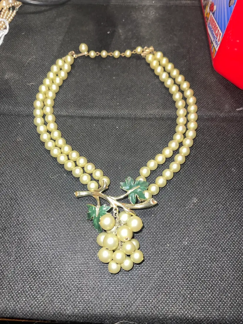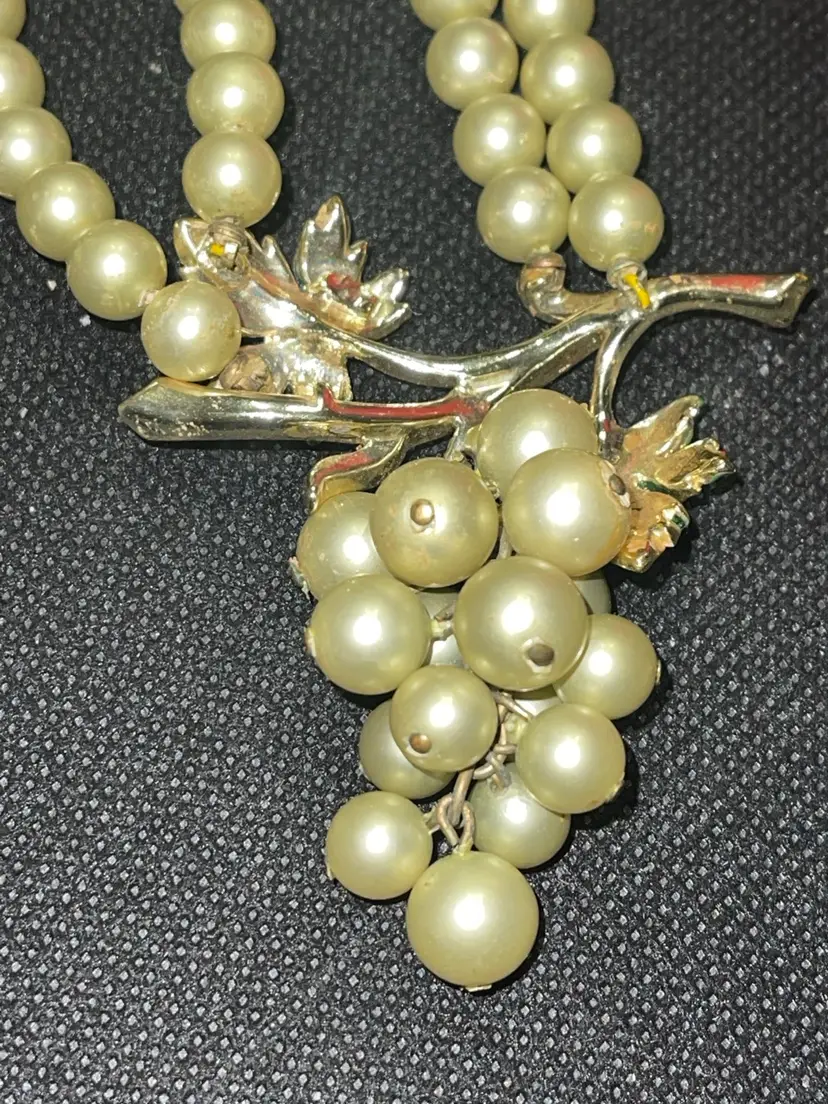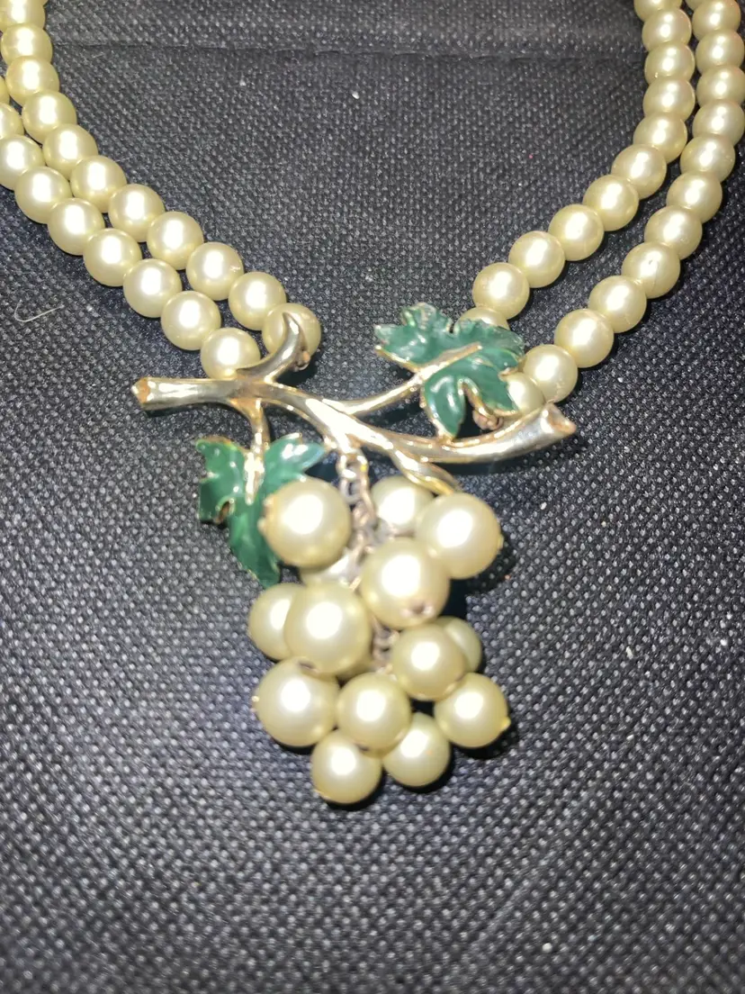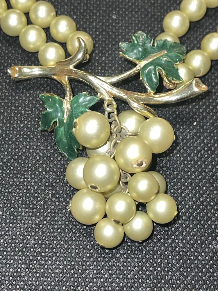 Grape Vine Cluster Dangle Enamel Leaf Bib Necklace. This has double Pearl strand with a grape vine cluster design that is 3-dimensional.
