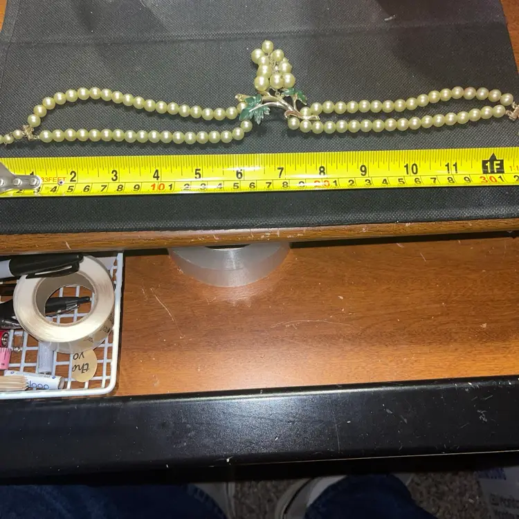 The necklace is fresh looking with light wear to the pearly finish, the gold tone is bright and the enameling is intact with very little wear or chipping. Measures 16" in length with the grape cluster dropping another 2 1/2" below that. It is 2 1/4" at the widest point.